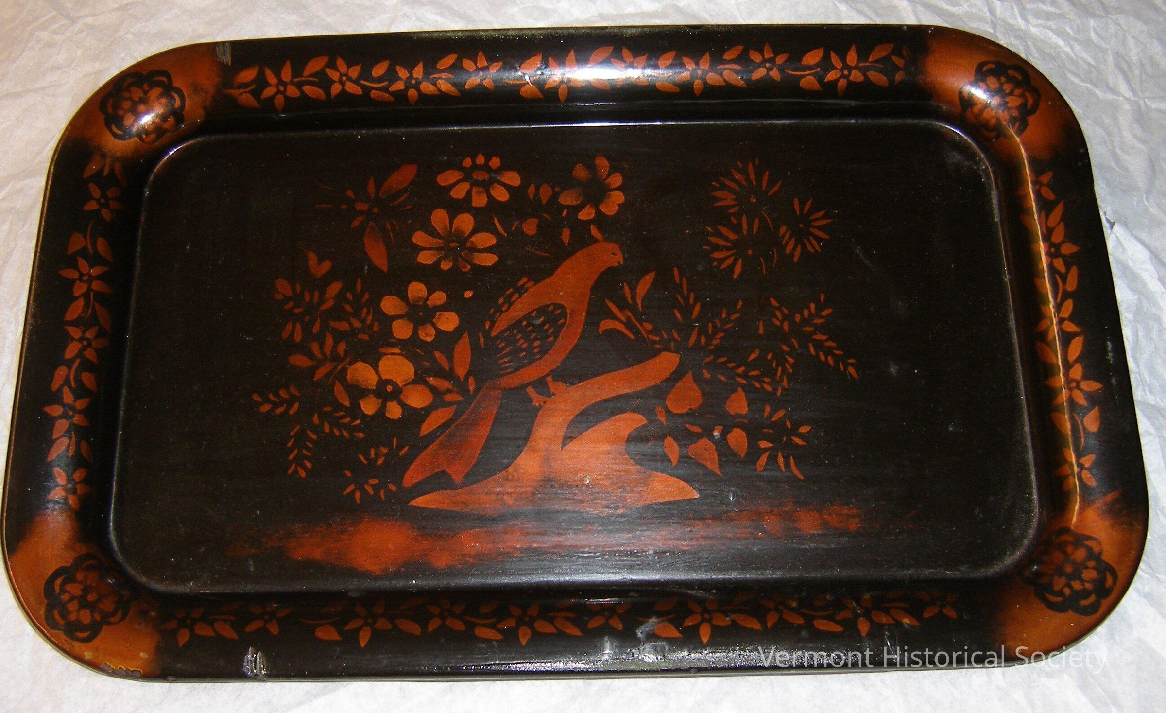 Black-painted metal tray stenciled in shades of yellow and orange with an image of a folk art style bird on a branch with flowers. The tray is rectangular with rounded corners, and the rim is stenciled with floral vines.Context