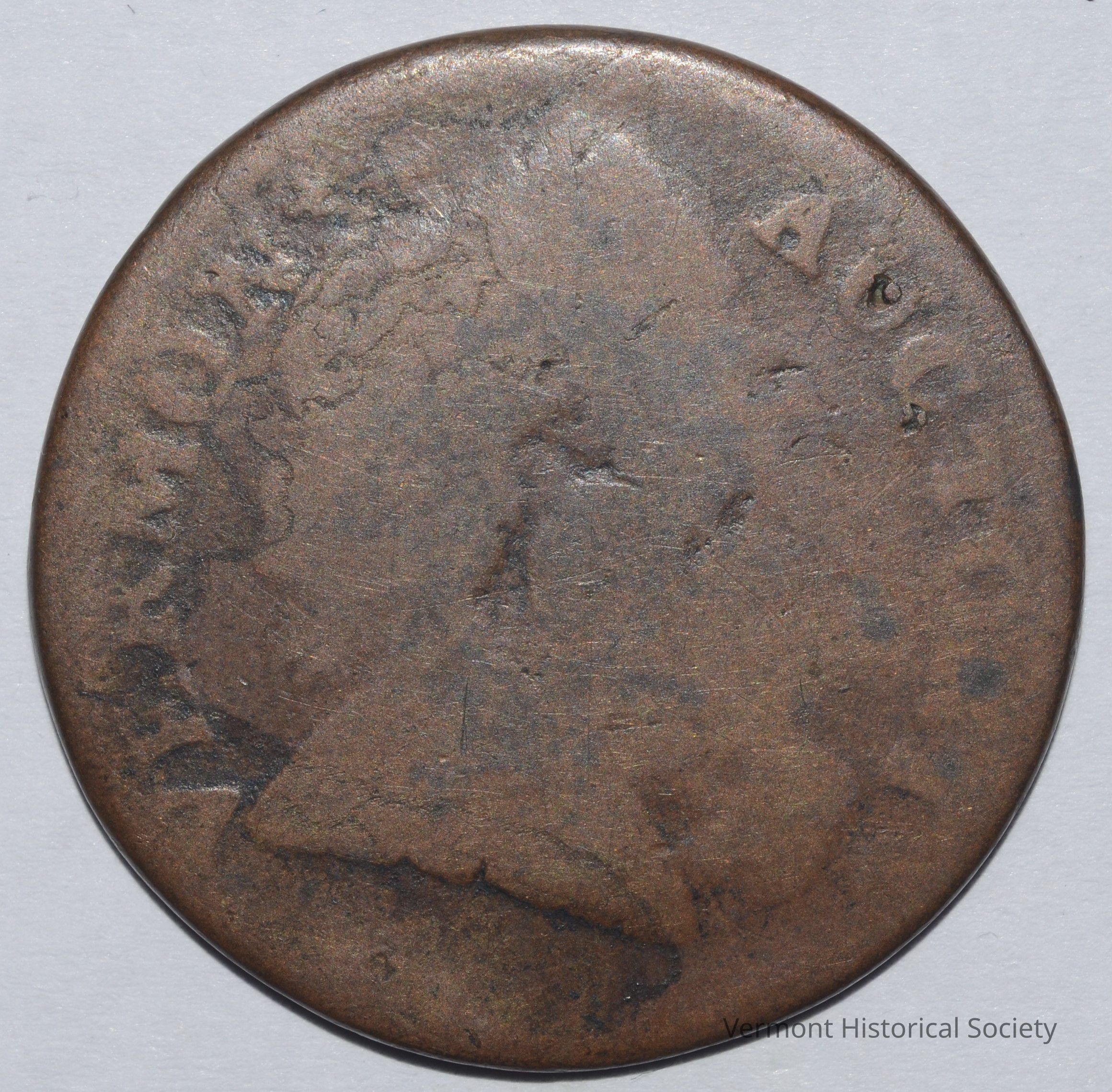 Copper coin with a bust on one side and the allegorical figure, Columbia, on the other. The face side shows a right-facing bust of a Roman figure, wearing a laurel wreath on his head, tied with a ribbon at the nape of his neck, and military armor. The words "VERMON AUCTORI" ring the edge. On the reverse, Columbia is shown swathed in loose fabric, seated next to a shield bearing the Union flag. She is holding a staff with a liberty cap in her left hand, and a small branch in her right hand. The date 1788 is at center bottom. Both sides are rubbed nearly smooth.Context