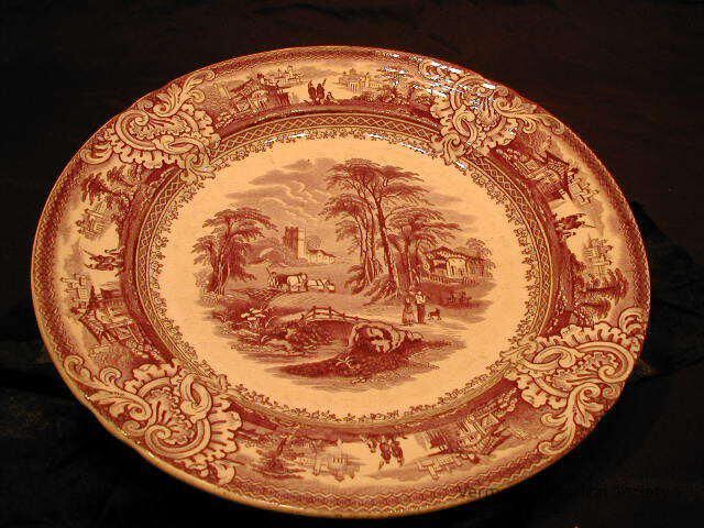 Purple and white transfer-printed dinner plate. The border is separated into four scenes, each showing two figures flanked by a building and trees. The center shows two figures and an animal in a pasture. A house is nearby, and a castle is in the distance. The reverse is marked, "T.J. & J. Mayer, World Scenery, Prize Medal, 1851".