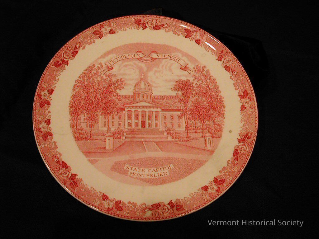Red-and-white transfer printed plate showing the Vermont Statehouse. The plate has no shaped rim, but has a border design of roses. The center of the plate shows the statehouse within a scene surrounded by young trees with a straight-topped hill behind. At the top of the scene a ribbon bears the inscription, "PICTURESQUE VERMONT", and the bottom is labeled, "STATE CAPITOL MONTPELIER".