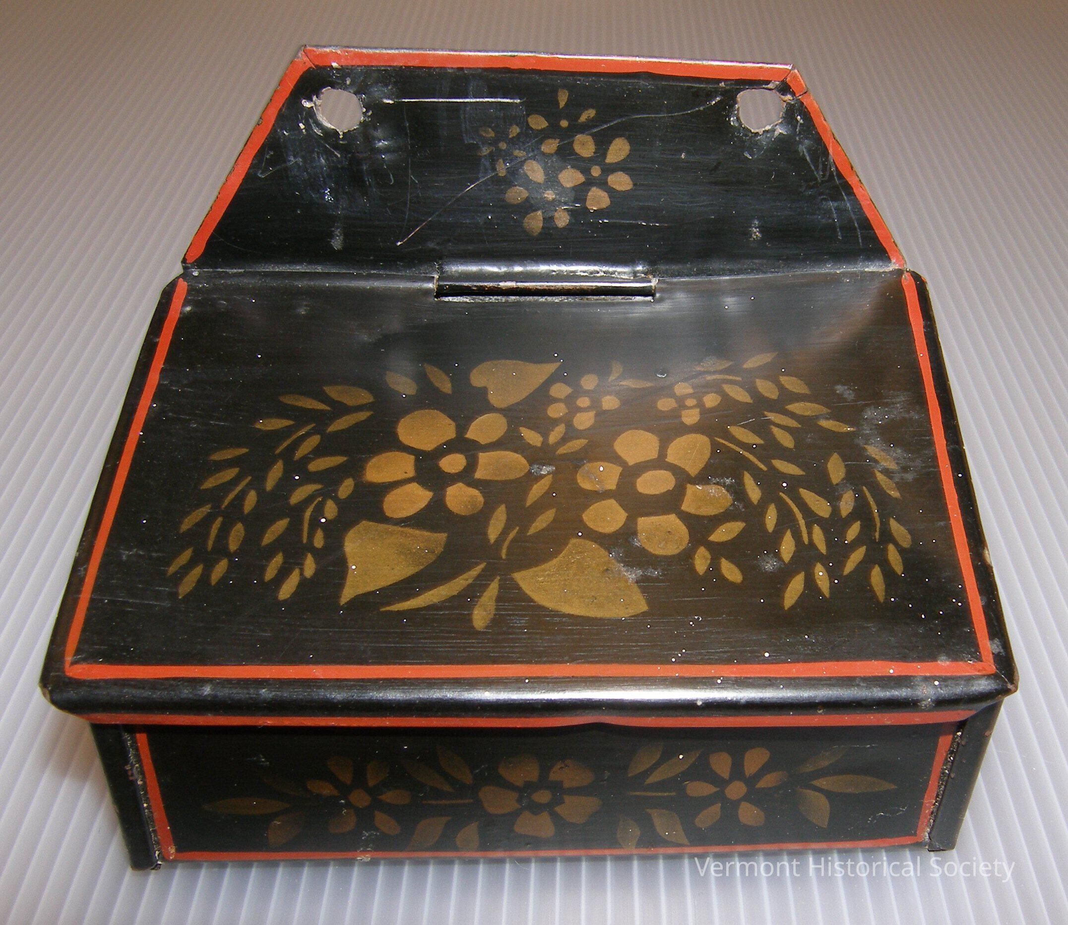 Black-painted tin matchbox. The box is stenciled in yellow with a simple floral design on all sides. The edges of each side are bordered with a narrow red line. The box has an angled top lid that hinges open with a central hinge. There are two holes on the upper back tab for hanging the box on a wall