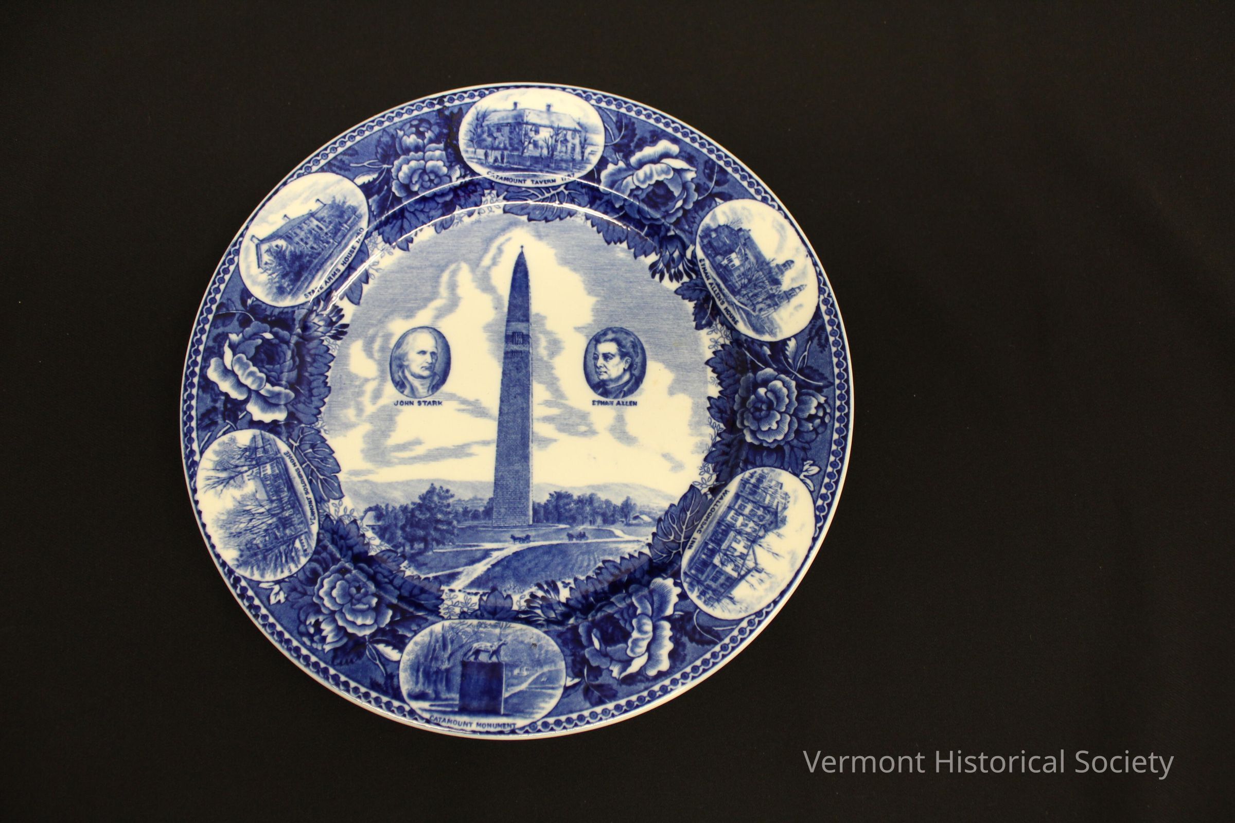 Blue-and-white transfer printed plate showing the Bennington Monument at the center. The monument is shown as part of a landscape scene, with the surrounding park at the bottom. Flanking the monument are portrait busts of John Stark and Ethan Allen. The border has large cabbage roses interspersed with oval-framed Bennington scenes. The back is labeled with the inscription, "Bennington Battle Monument Erected 1867-1881 "There are the redcoats; they are ours, or Molly Stark sleeps a widow to night." Gen: John Stark. At Battle of Bennington, Aug: 16th 1777." It also bears a Wedgwood maker's mark and the label, "Made in England for C. F. Atkins, Bennington, Vermont."