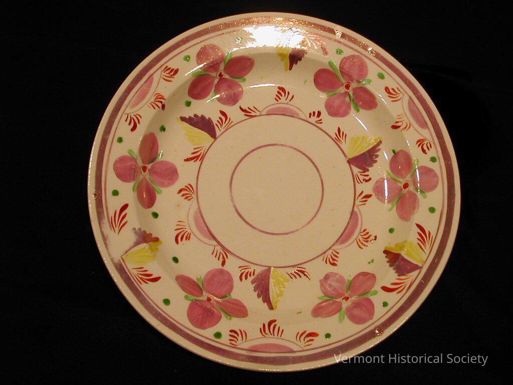 Dessert plate with a hand-painted floral design in pink luster, yellow, and green. The well is painted with a pink luster band giving the appearance of a small well. From the band to the lip of the plate, the decoration is filled with large quatrefoils and purple-and-yellow leaves. The reverse is stamped with the numbers "125" and "3".