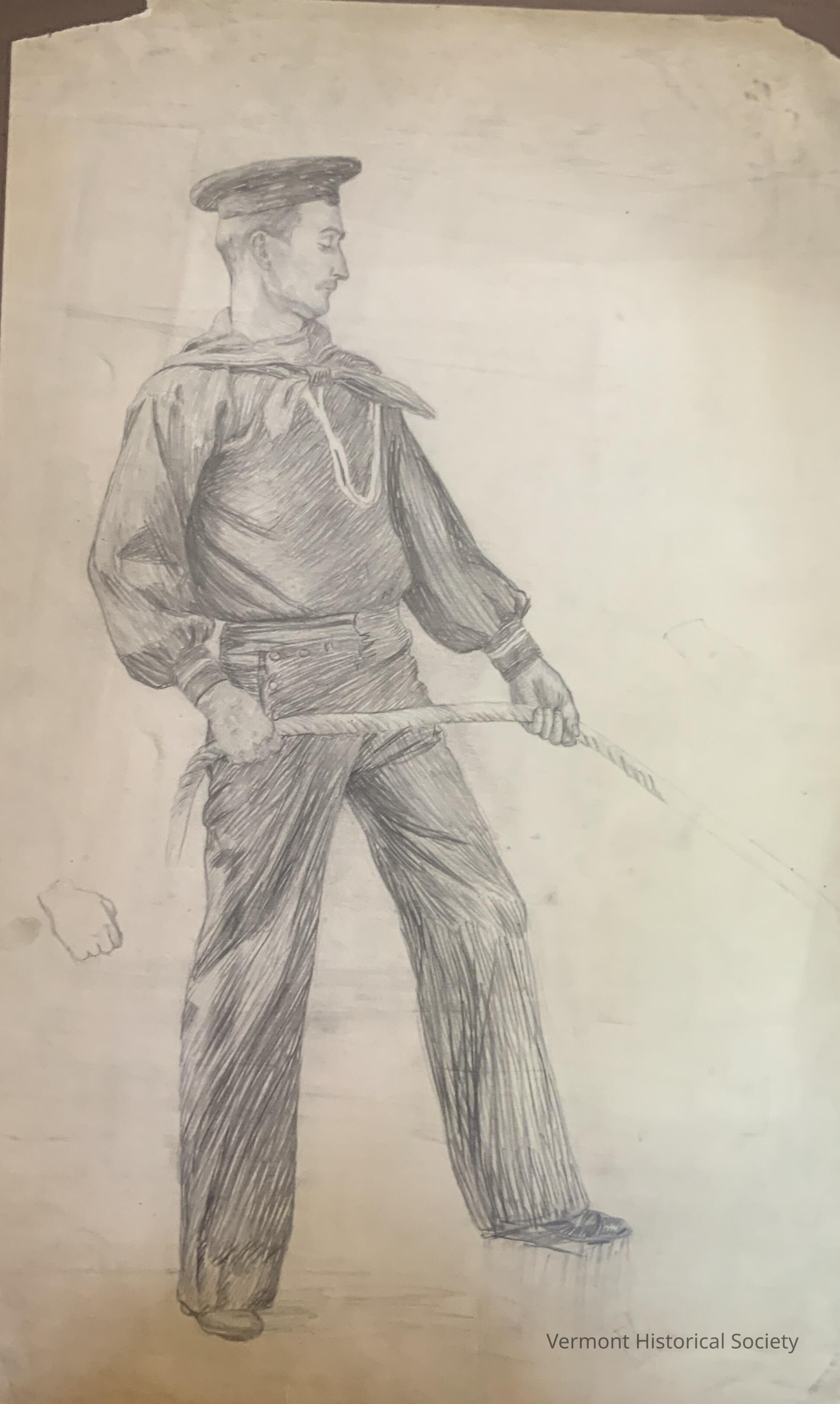 A drawing of a sailor pulling on a rope. There are sketches of his hands around the page and the drawing is not finished. It is signed in the bottom right corner and dated “Feb [unreadable].”Type of Drawing