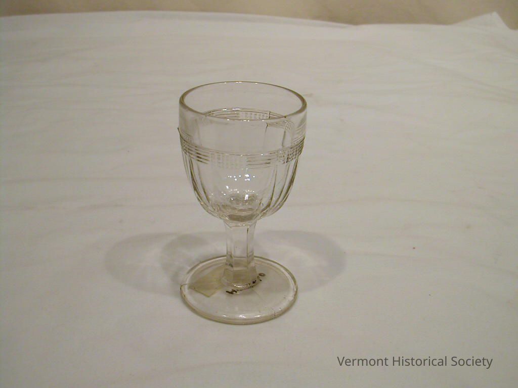 Small, pressed glass cordial glass. The round cup sits on a 6-sided central stem.