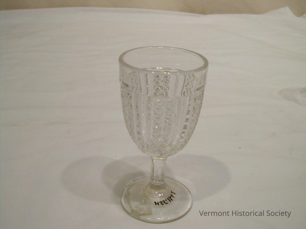 Pressed glass cordial glass in a variation of the feather pattern. The cup is molded with textured, vertical stripes.