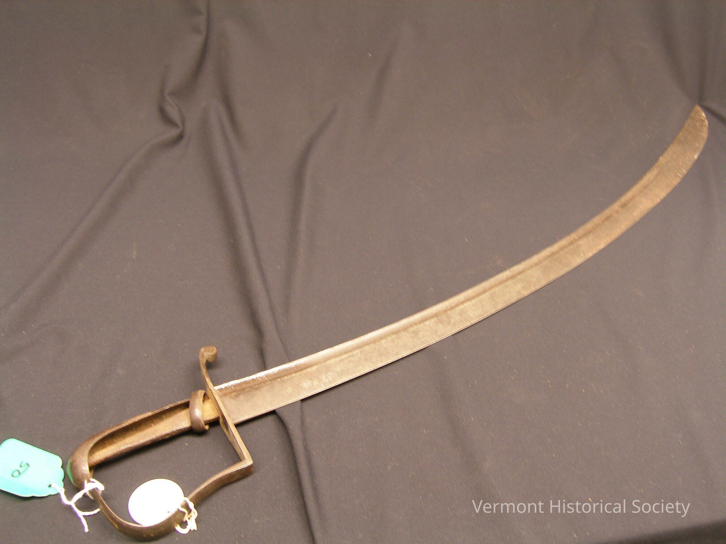 Curved sword with no scabbard. The grip is missing, leaving a bare tang with a loose metal ring holding the sword and guard together.