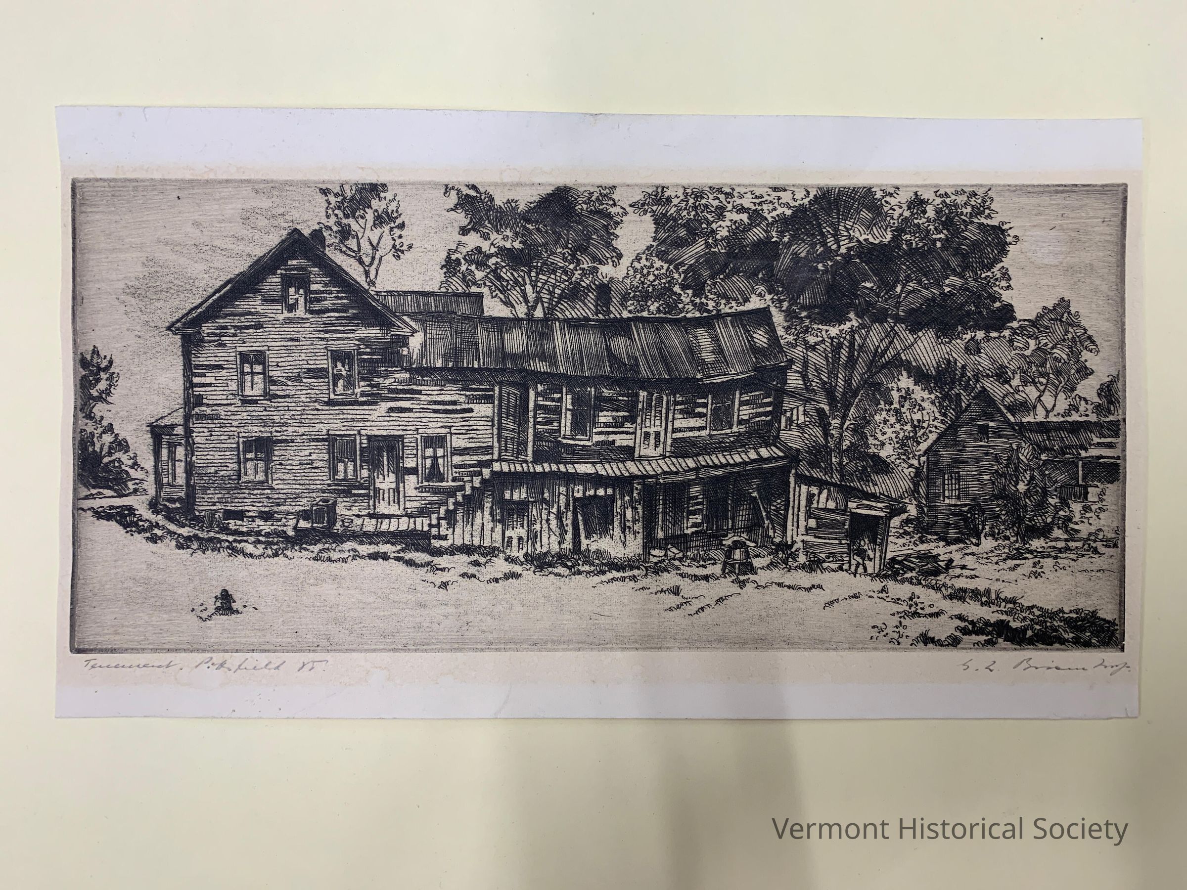 Rectangular engraving showing a large tenement building from the side. The building faces the left and appears to consist of an original structure with additions added onto the back in multiple level, including a second-story landing and a lean-to. A second building appears in the background with roughly the same shape. The subject, "Tenement, Pittsfield VT.", is inscribed in pencil at the bottom left, and the artist, "S. [illeg] Brian [illeg]", is inscribed in pencil at the bottom right.Artwork Details