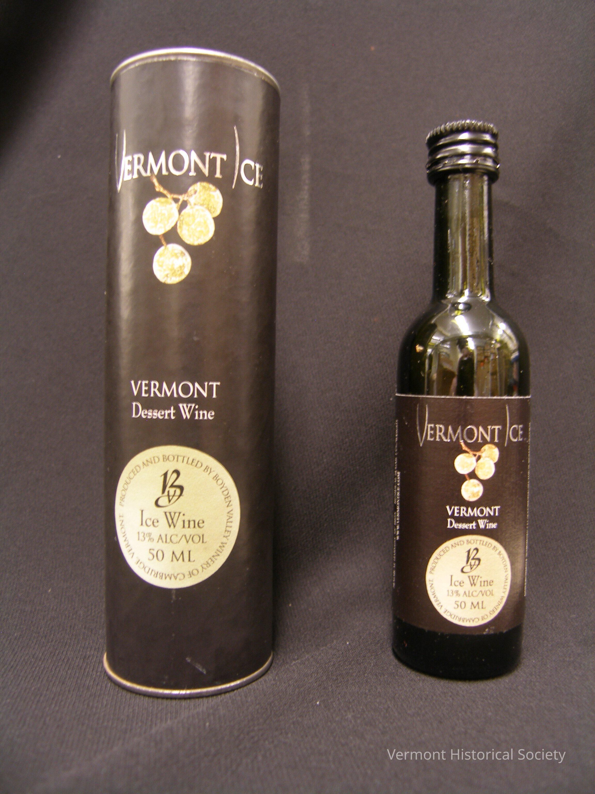Small, dark green bottle with cardboard case. The bottle has a screw-on metal cap and a paper sticker label that reads, "Vermont Ice / VERMONT Dessert Wine". There is a gold circle at the center bottom of the label that reads, "Ice Wine 13% ALC-VOL 50 ML", in the center and, "PRODUCED AND BOTTLED BY BOYDEN VALLEY WINERY OF CAMBRIDGE VERMONT" around the edge. The cardboard tube is printed with the same label. There is a round metal cap that closes the top of the tube.