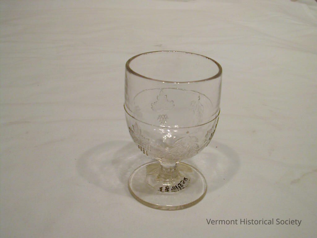 Pressed glass cordial glass in a variation of the Magnet and Grape pattern. The cup is molded with grape leaves and grape bunches.