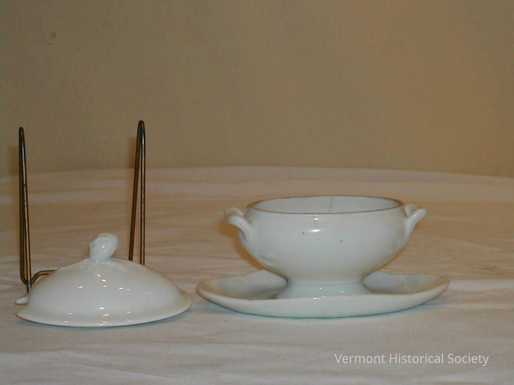 Covered dish consisting of a small tureen attached to a base, and a lid. The tureen has two handles. The lid has a central knob handle shaped like an acorn. There is a hole building into the edge of the lid for a spoon.