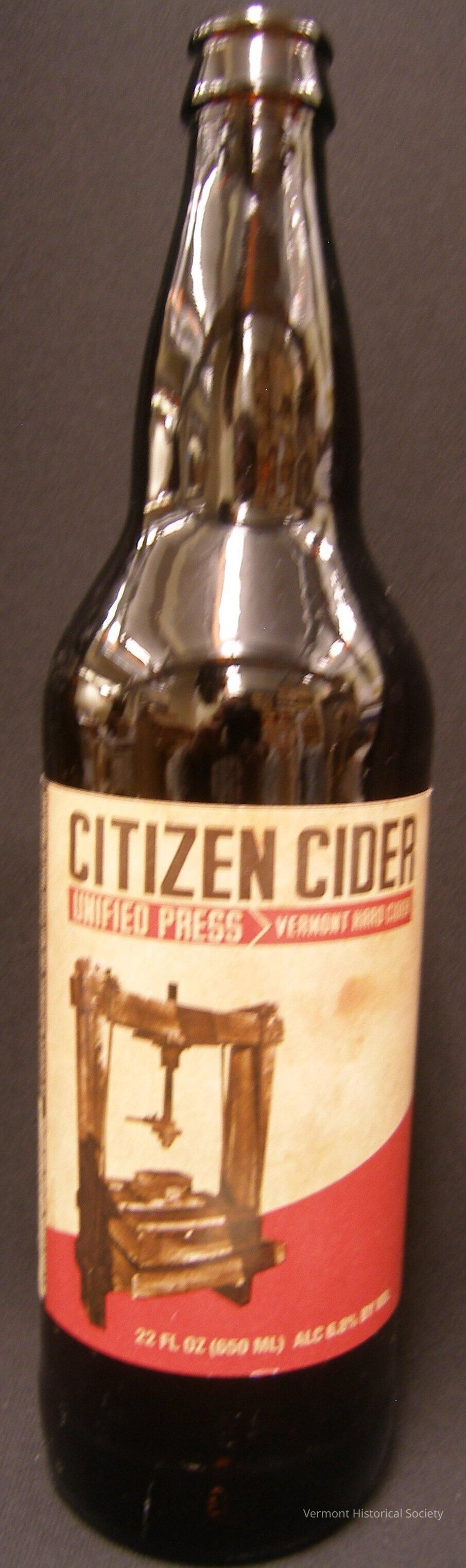Brown glass 22 fluid ounce bottle with a tan,red, and brown paper label. The label states: "CITIZEN CIDER/UNIFIED PRESS/VERMONT HARD CIDER/ 22 FL OZ (650 ML) ALC 6.8% BY VOL." One side of the label has a government warning. The other side of the label has a brief bio of the company, a list of the ingredients, and the address: CITIZEN CIDER, LLC/60 Laurette Drive, Essex, VT 05452.Acquisition
