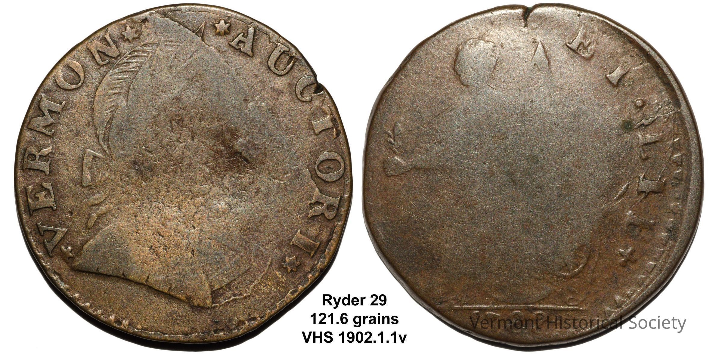 Copper coin with a bust on one side and the allegorical figure, Columbia, on the other. The face side shows a right-facing bust of a Roman figure, wearing a laurel wreath on his head, tied with a ribbon at the nape of his neck, and military armor. The words "VERMON AUCTORI" ring the edge. On the reverse, Columbia is shown swathed in loose fabric, seated next to a shield bearing the Union flag. She is holding a staff with a liberty cap in her left hand, and a small branch in her right hand. Both sides are rubbed almost completely smooth.Context