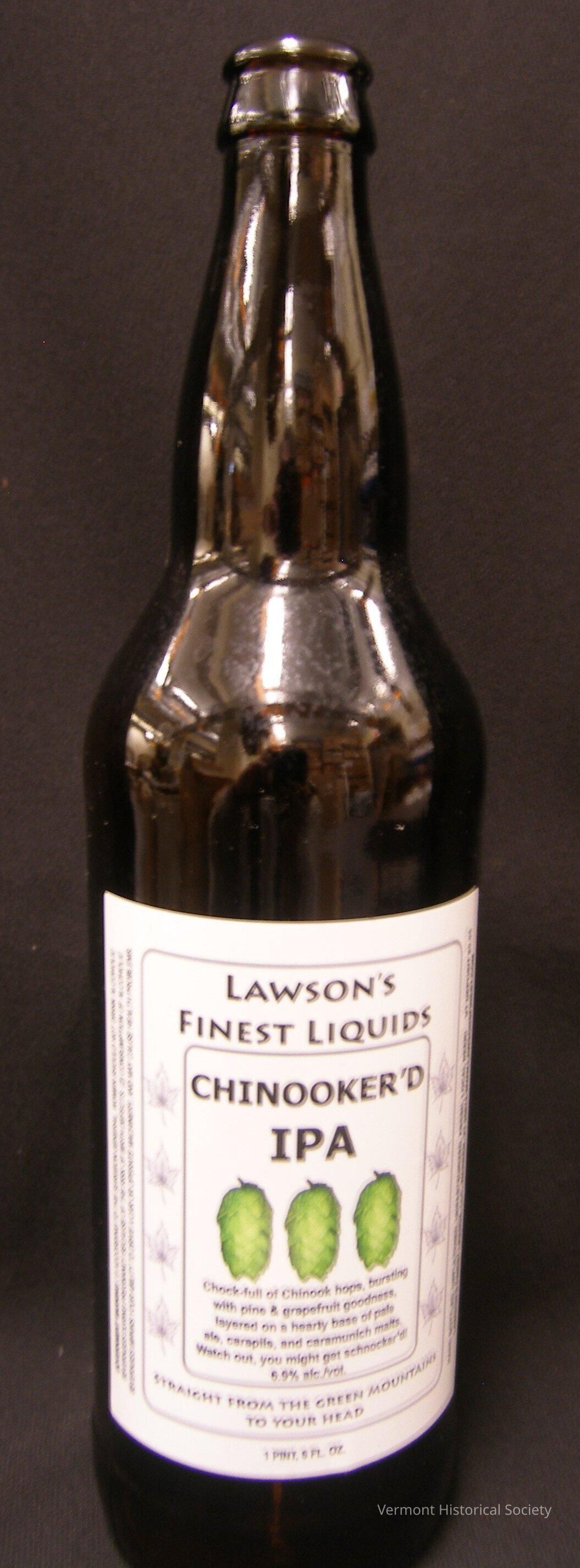 Brown glass1 pint 6 oz. bottle with a white label indicating: "LAWSON'S FINEST LIQUIDS/CHINOOKER'D IPA". "Chock-full of Chinook hops, bursting with pine & grapefruit goodness, layered on a hearty base of pale ale, carapils, and caramunich malts. Watch out, you might get schnocker'd! 6.9% alc./vol." Down the left side of the label in a government warning. Dow the right side : "Hand bottled, unfiltered, unpasteurized, fresh local beer! VT deposit $0.05/Lawson's Finest Liquids, LLC, Warren, VT..."Acquisition