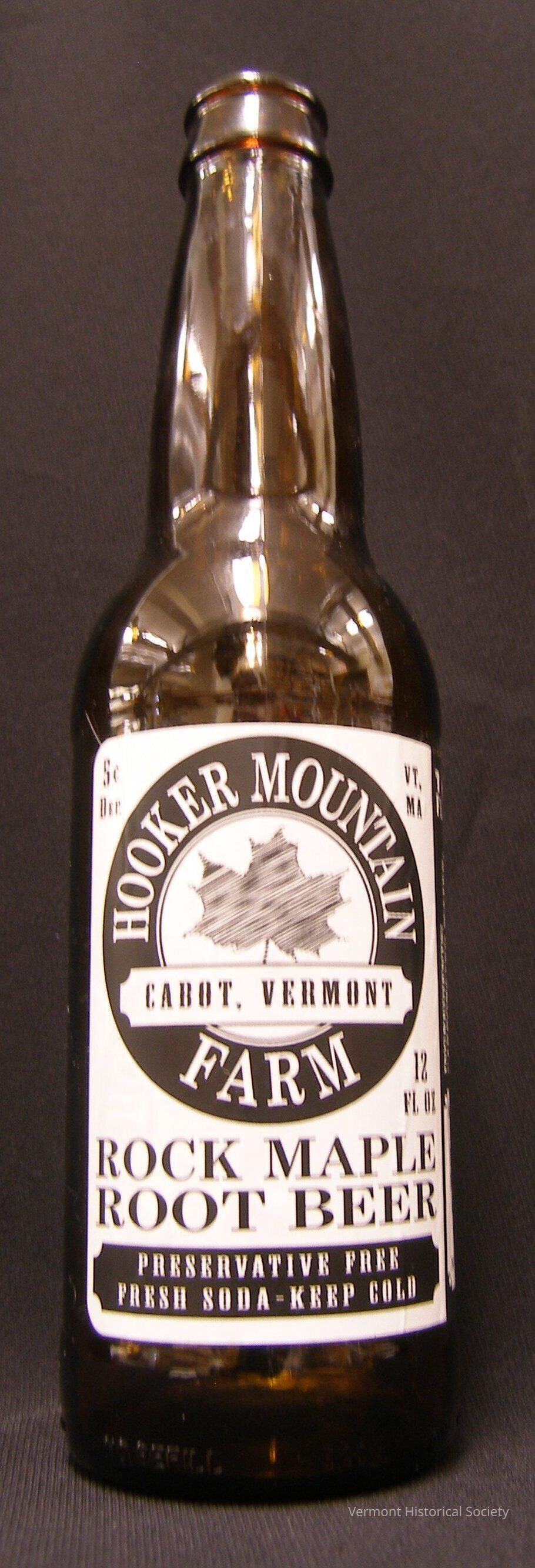 Brown 12 fluid ounce glass bottle with a white and black label. The label states: "Hooker Mountain Farm, Cabot, Vermont/Rock Maple Root Beer/ preservative free fresh soda- keep cold." The label also lists the ingredients and "Made and bottled at Hooker Mountain Farm, 1193 Lovely Road, Cabot, Vermont/www.hookermountainfarm.com."Context