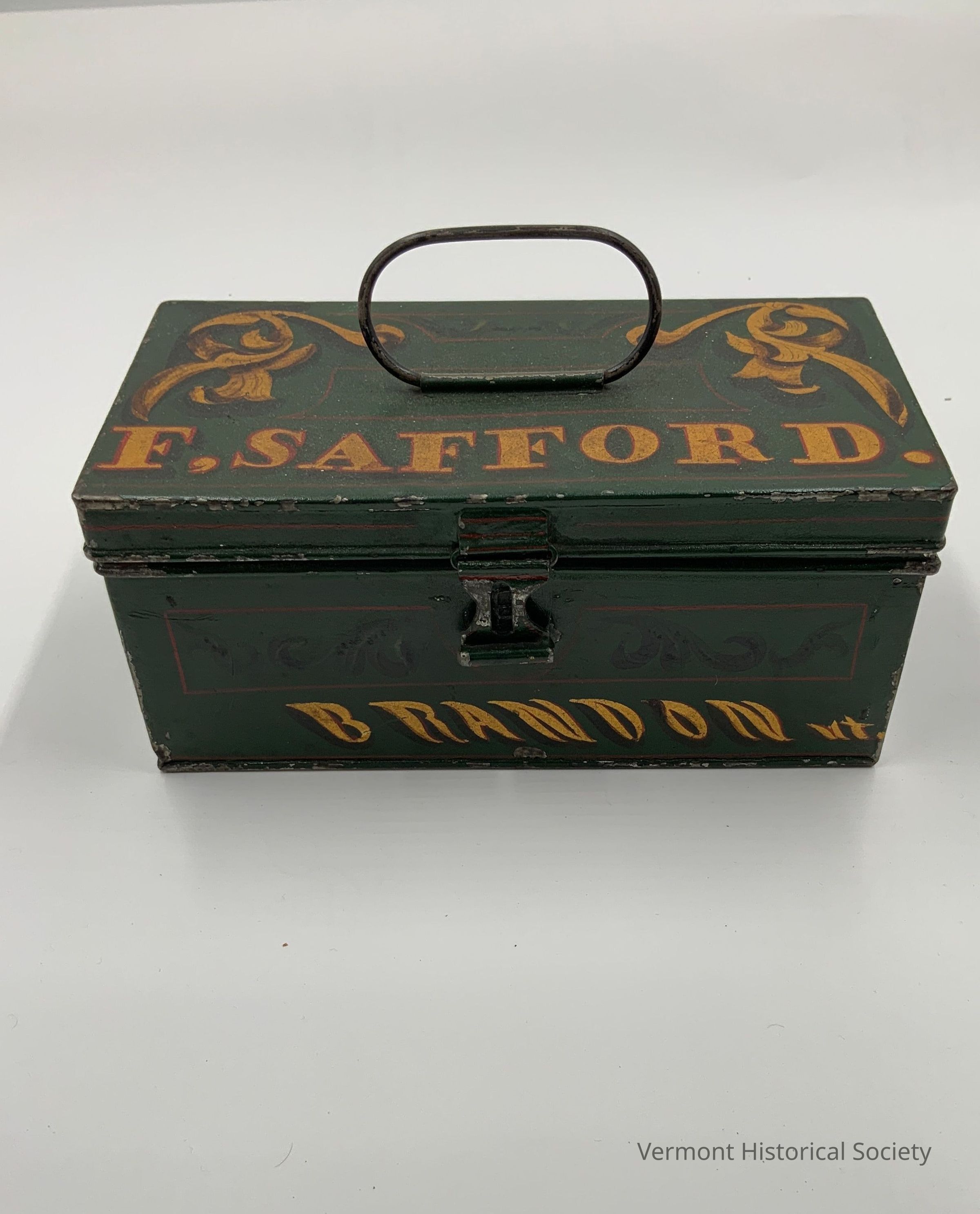 Green-painted document box. The tin box has a wire handle on the top and gold-painted decoration on the top corners. The top of the box is painted, "F. SAFFORD." in gold edged in red on the lid and "BRANDON vt" in gold edged in black on the lower edge of the front. The box has border decoration in red and black thin lined paint on all sides and a simple hinged latch on the front. The interior is unfinished tin.Acquisition
