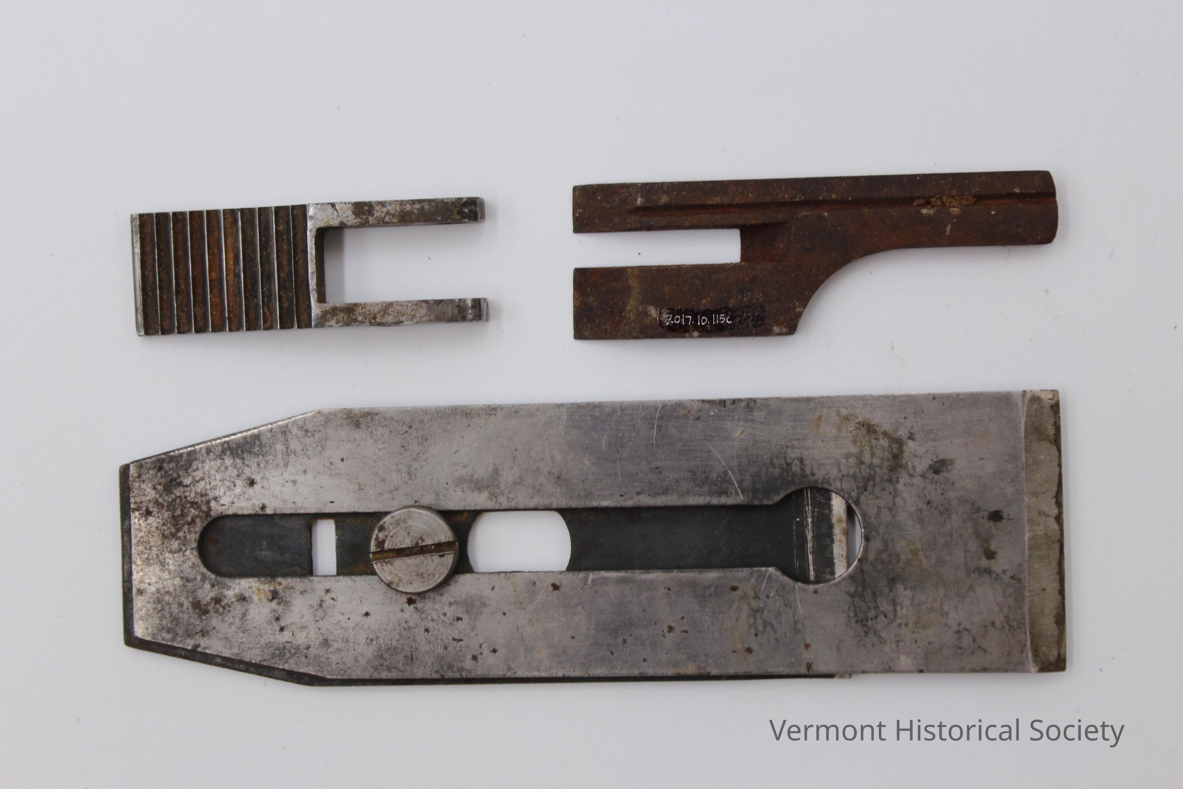 Metal parts for a wood plane. The parts are the blade attached to the chip breaker, and two other unidentifiable pieces.Context