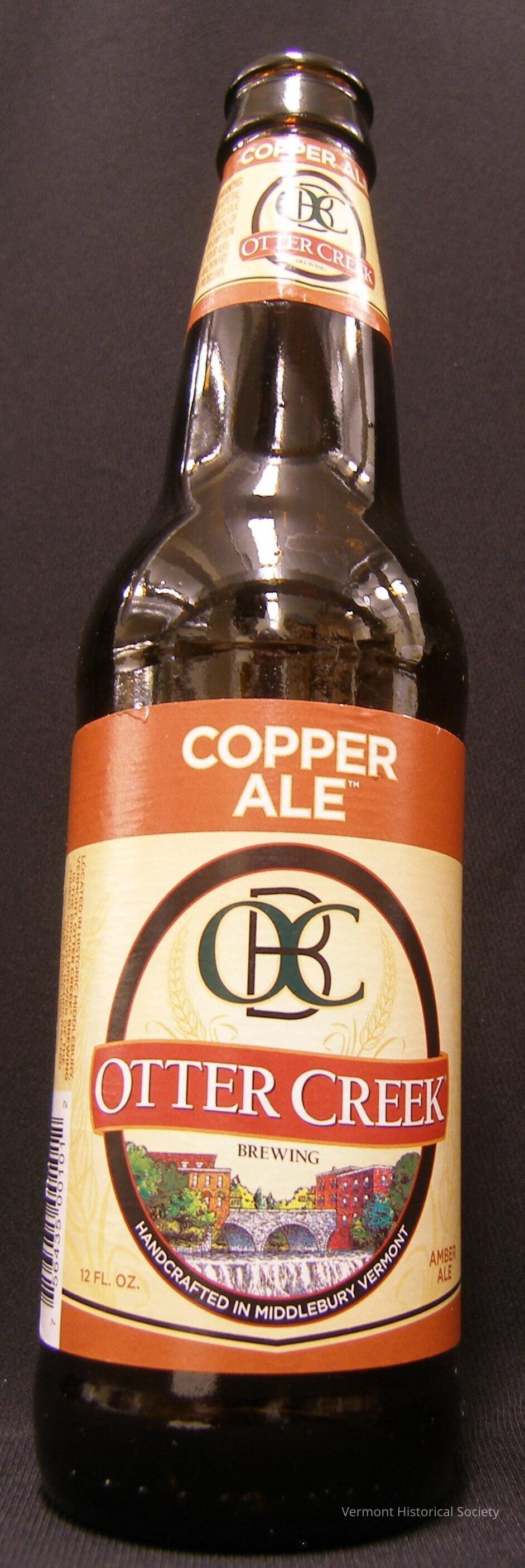 12 fluid ounce brown glass bottle with a paper label stating: "Copper Ale/Otter Creek Brewing/ Handcrafted in Middlebury, Vermont/ Amber Ale." A smaller label around the neck of the bottle has the government warning and a brief bio of the brewery.