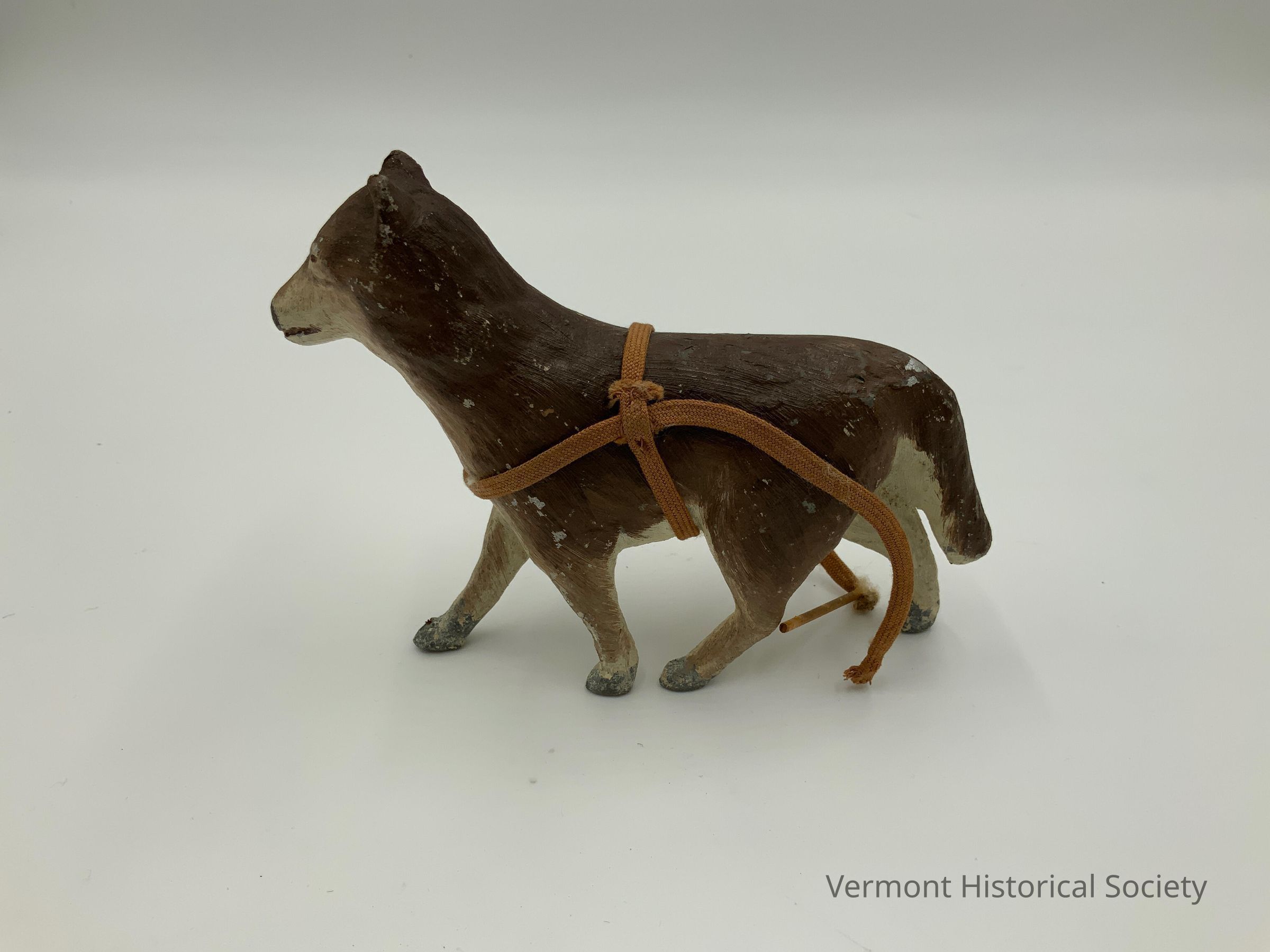 Miniature cast-iron sled dog. The dog is molded to appear as if it's walking, and there is a harness made of woven cotton tape around its body. It is painted in dark brown with a light brown stomach. Its tail is lowered behind it.