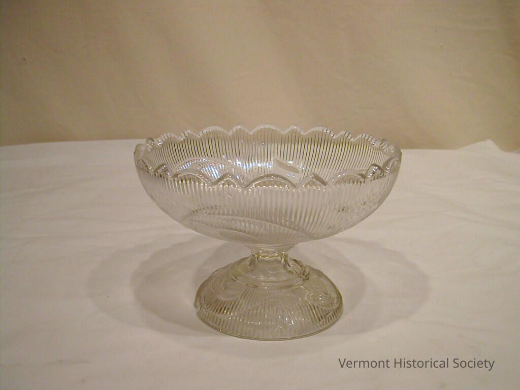Pressed glass compote molded in the Ribbed Bell Flower pattern.