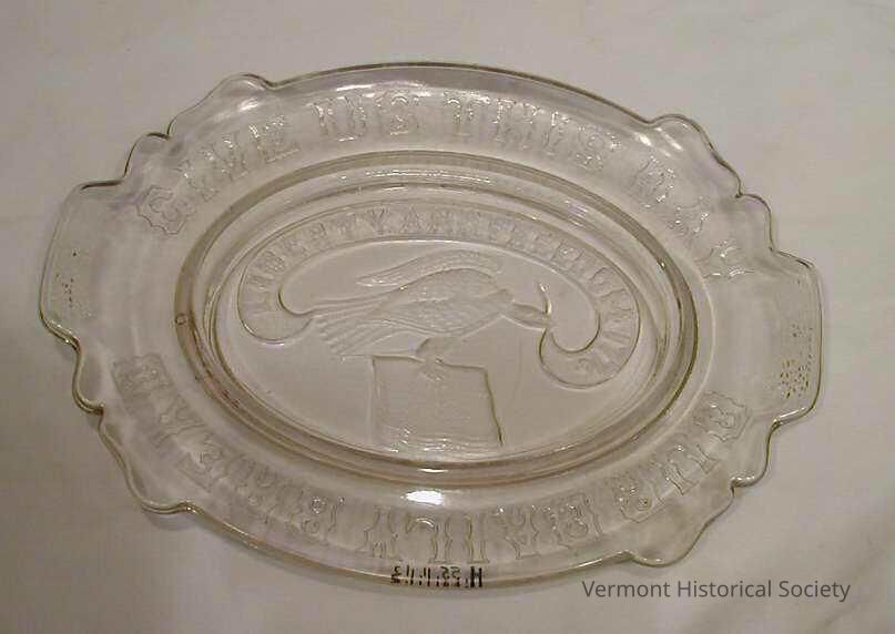 Pressed glass oval platter or bread plate. The handles are molded with sheaves of wheat. In the center is an eagle holding a banner that reads, "LIBERTY AND FREEDOM, 1776", and a book that reads, "Constitution of the United States". Around the edge of the plate is the molded inscription, "GIVE US THIS DAY OUR DAILY BREAD".Context
