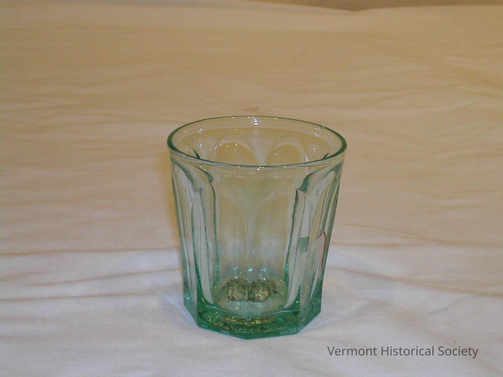 Green glass pressed glass tumbler. There are 9 flutes around the cup.