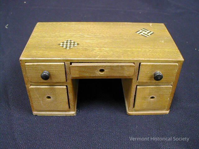 Miniature wooden desk. The desk has five drawers, two of which retain knobs. There are two patterned squares inlaid into the desk top.