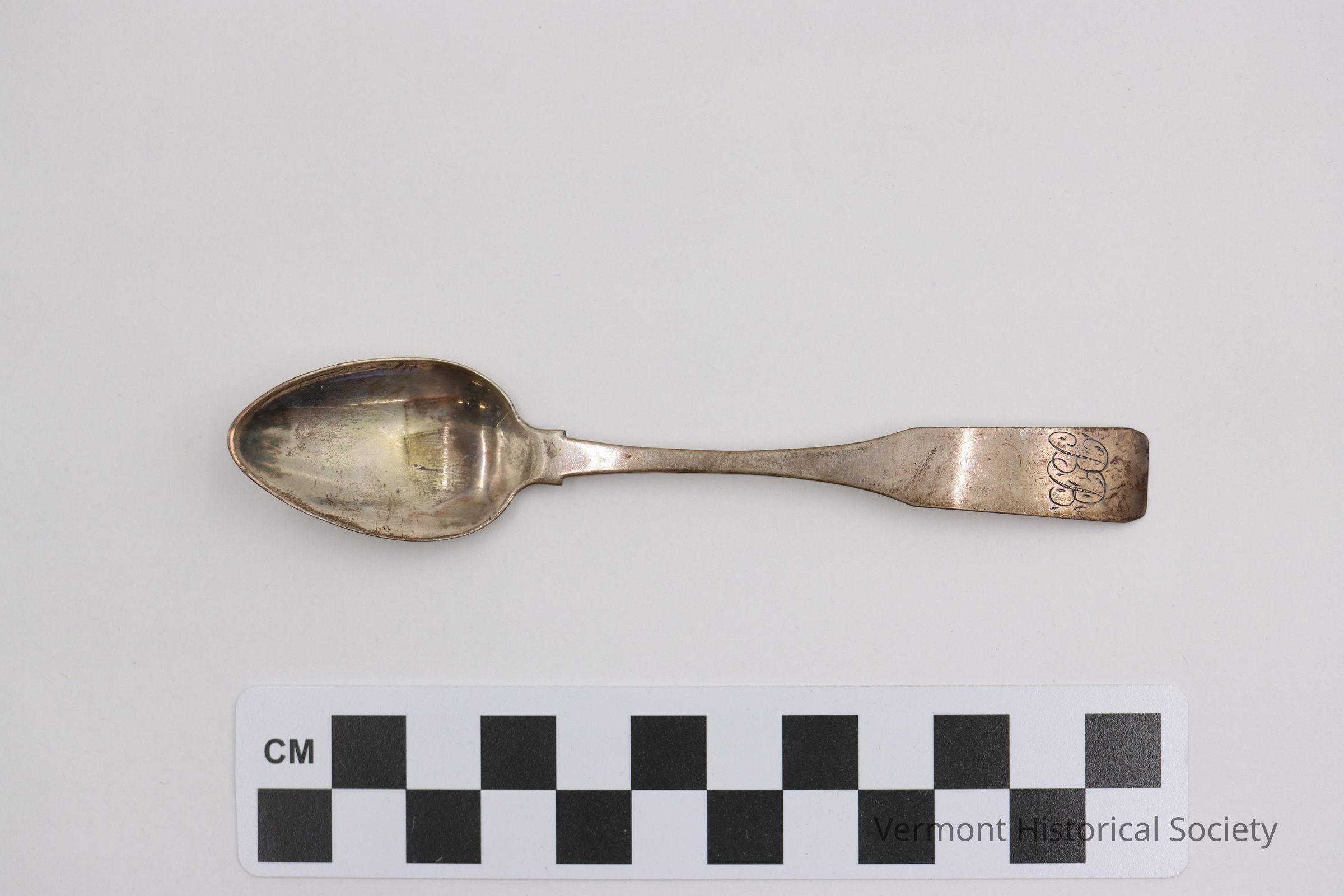 1 of 6 teaspoons engraved with the initials "BB". The back is stamped with the mark "TC" within a rectangle.