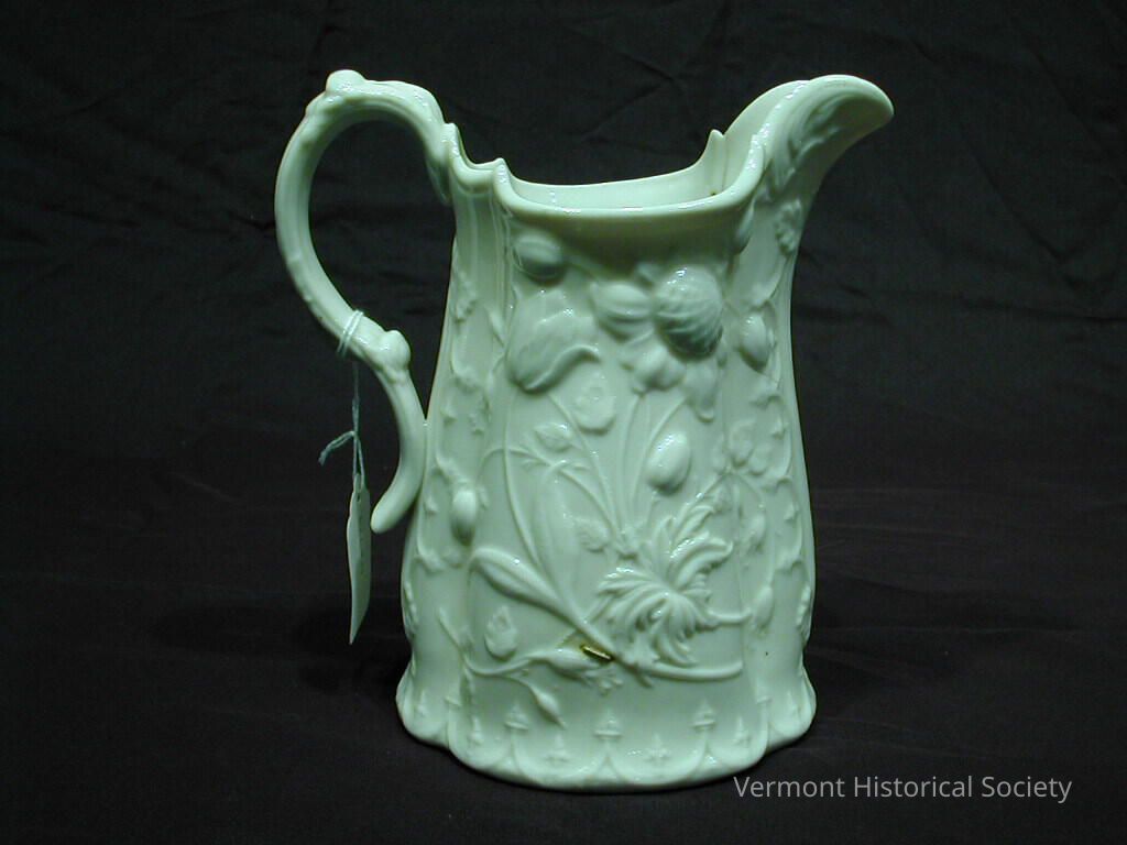 Molded white pitcher with slightly glossy glaze. The pitcher is molded with an allover pattern of flowers, including sunflowers, carnations, bluebells, and tulips, and has a geometric design across the bottom and front. There is a large crack on the right side of the pitcher which has been mended by three metal staples, and there is an additional staple on the left side.Context