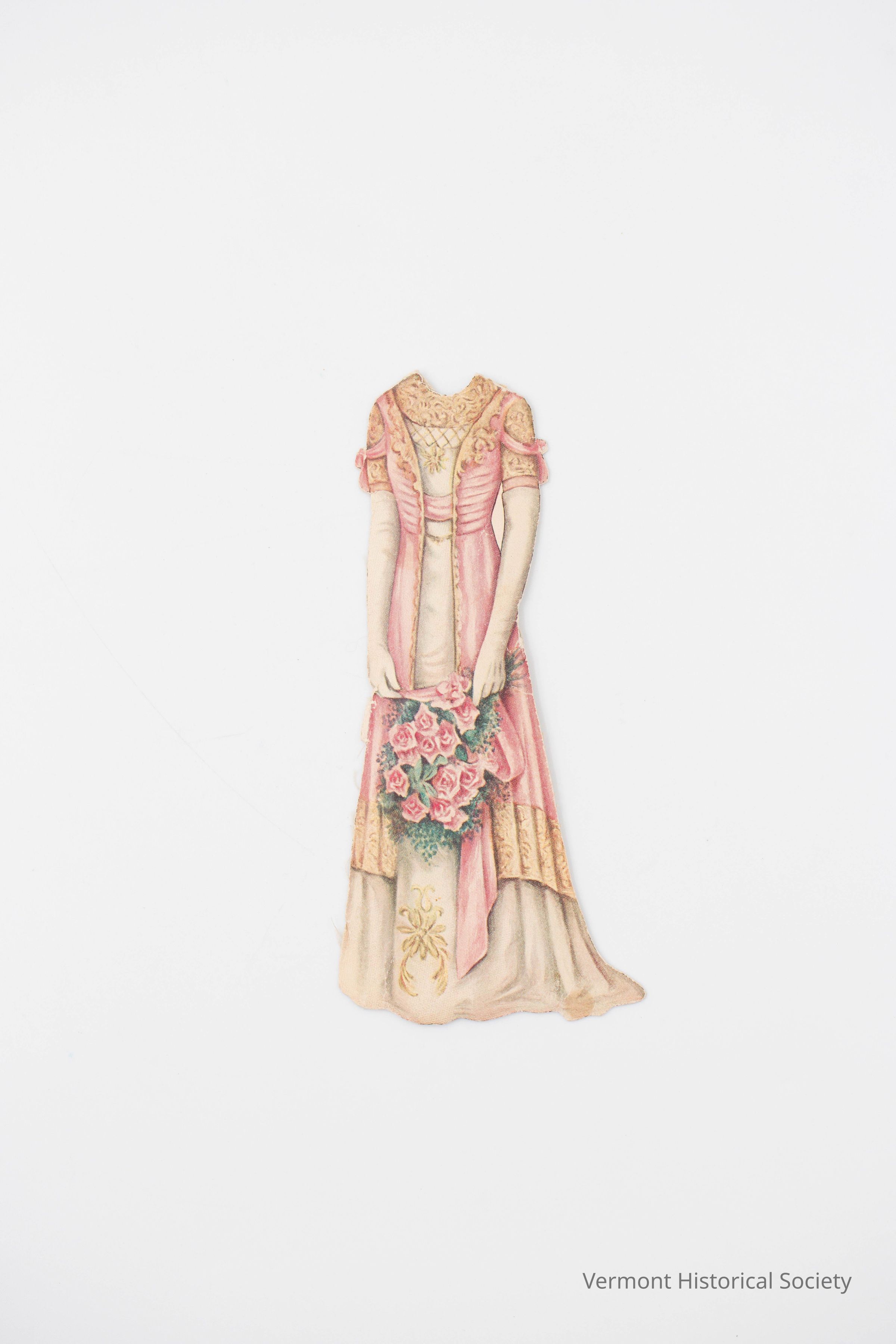 Edwardian-style pink dress for a paper doll. There is a white underdress visible at the center front, and the left hand is holding a large bouquet of pink flowers.Context