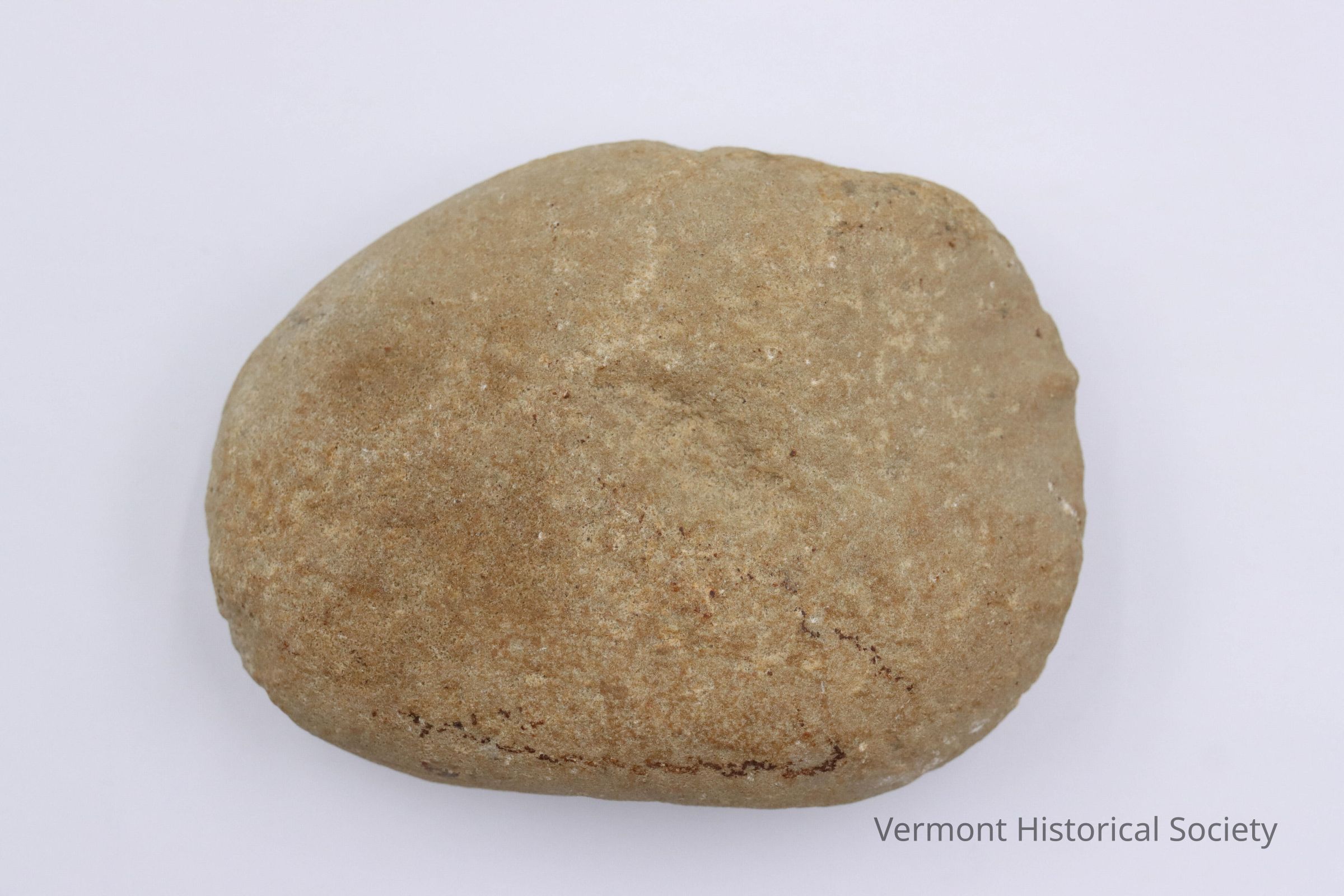 Ground stone anvil stone. There is a pecked, V-shaped groove in the center of each face.Context