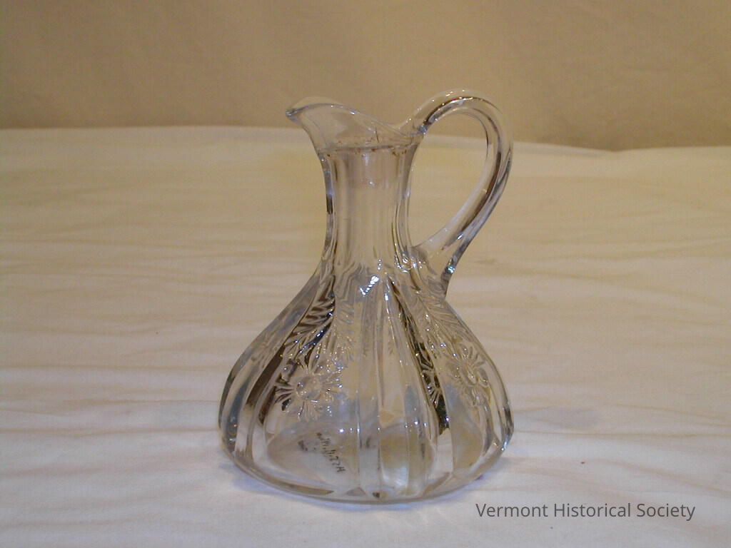 Clear glass mold-blown cruet with missing stopper. The cruet is molded with flutes and daisies.