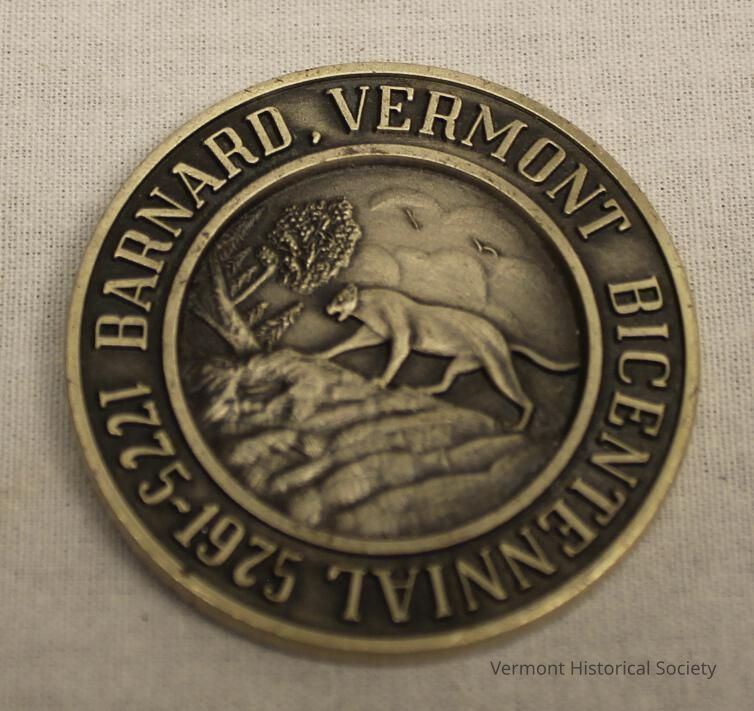 Sterling silver commemorative medal. One side is molded with the inscription, "BARNARD, VERMONT BICENTENNIAL 1775-1975" around the edge and a catamount walking on a rock toward a tree. The other side is molded with the inscription, "VERMONT INDEPENDENCE 1777-1977 AMERICAN REVOLUTION 1776-1976" around the edge and the map outline of Vermont with a house near the center alongside a setting sun and a diamond-shaped fort with the label, "FORT DEFIANCE".Context