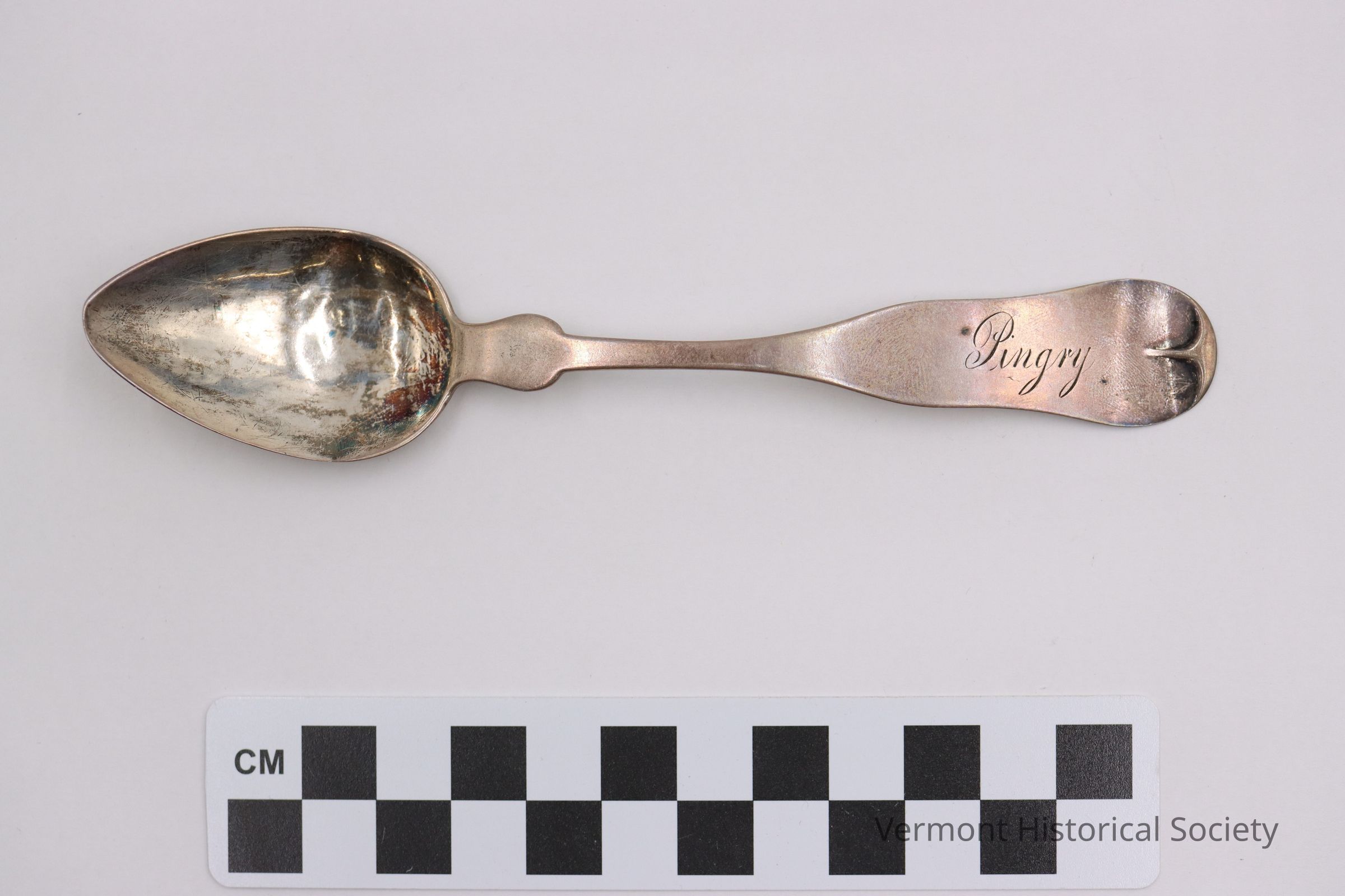 Coin silver teaspoon with a pointed bowl and rounded shoulder. The handle is engraved with the name "Pingry". The back of the handle is marked "R.O. FORBUSH" and "PURE COIN."