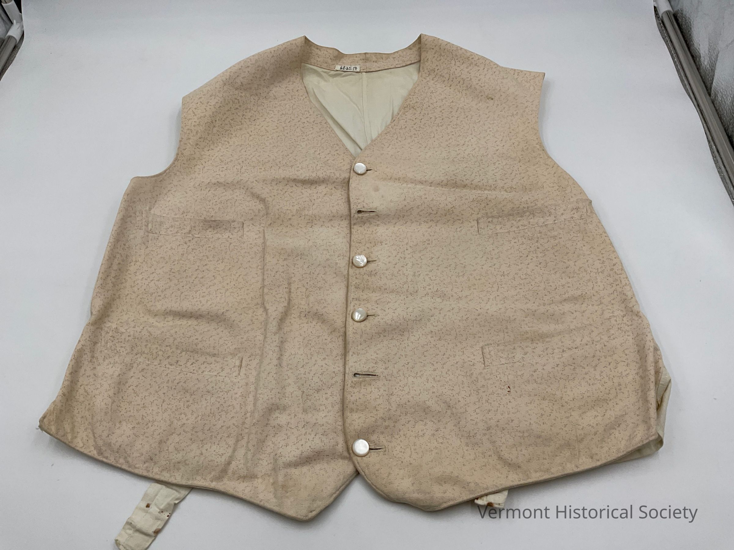 Man's linen vest. The front is constructed from white fabric woven with subtle blue flecks. This vest has four welt pockets. Running down the center front are six buttons made from mother-of-pearl. The vest lacks a collar or lapels. The back of the vest is fashioned from plain white cotton. A strap is included at the waist on the backside of the vest to adjust fit.Context