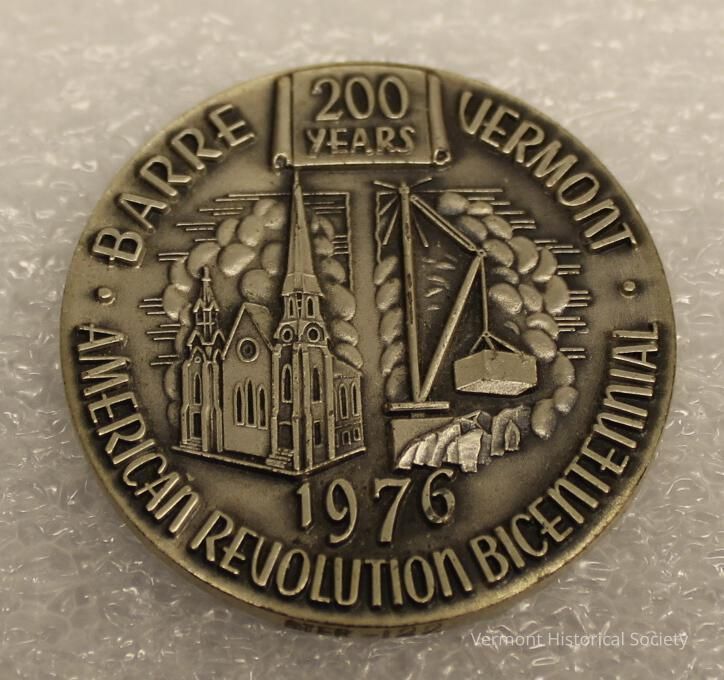 Sterling silver commemorative medal. The medal is molded on one side with the inscription, "BARRE / 200 YEARS / VERMONT / AMERICAN REVOLUTION BICENTENNIAL / 1976" around the edge and images of a church and a crane lifting a large granite block in the center. The other side is molded with the inscription, "BARRE CITY * BARRE TOWN / 1776 . 1976" around the edge and an outline of the map of Vermont with a star in the middle and the inscription, "TODAY IS HISTORY TOMORROW/ CHARTERED BARRE IN 1780" in the center. The edge of the medal is etched, "Ster 122".Context