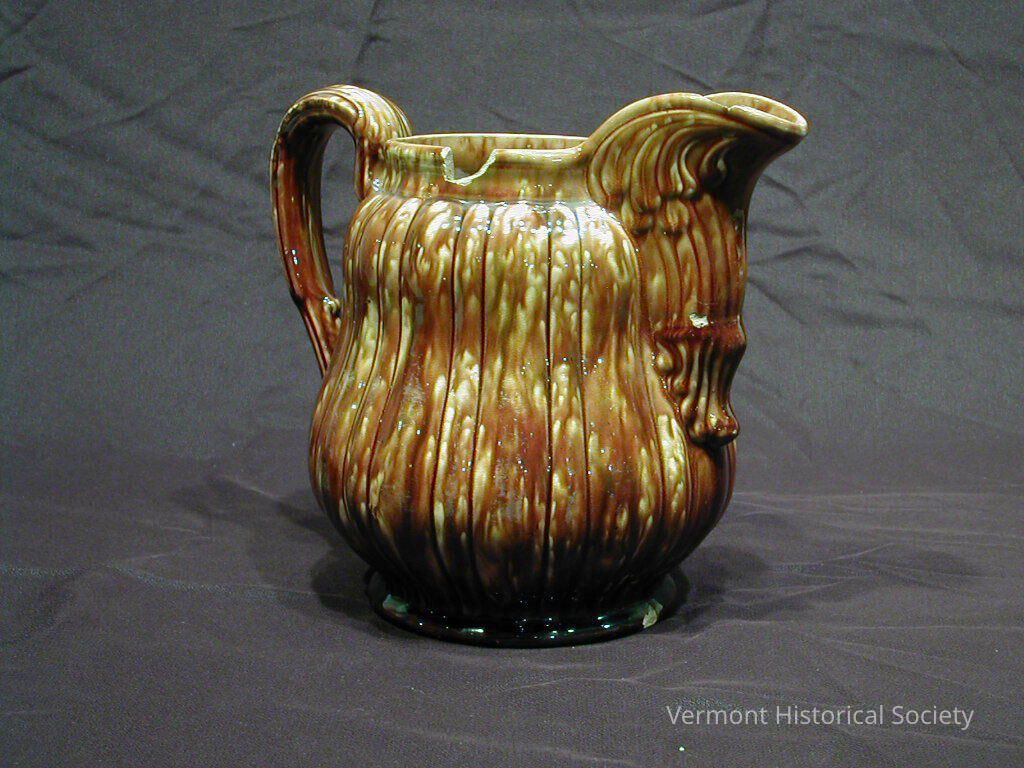 Rockinghamware (or flint enameled) pitcher. The fluted body of the pitcher flares outward at both the bottom and top. The spout is shaped like an acanthus leaf and begins halfway down the body of the pitcher.