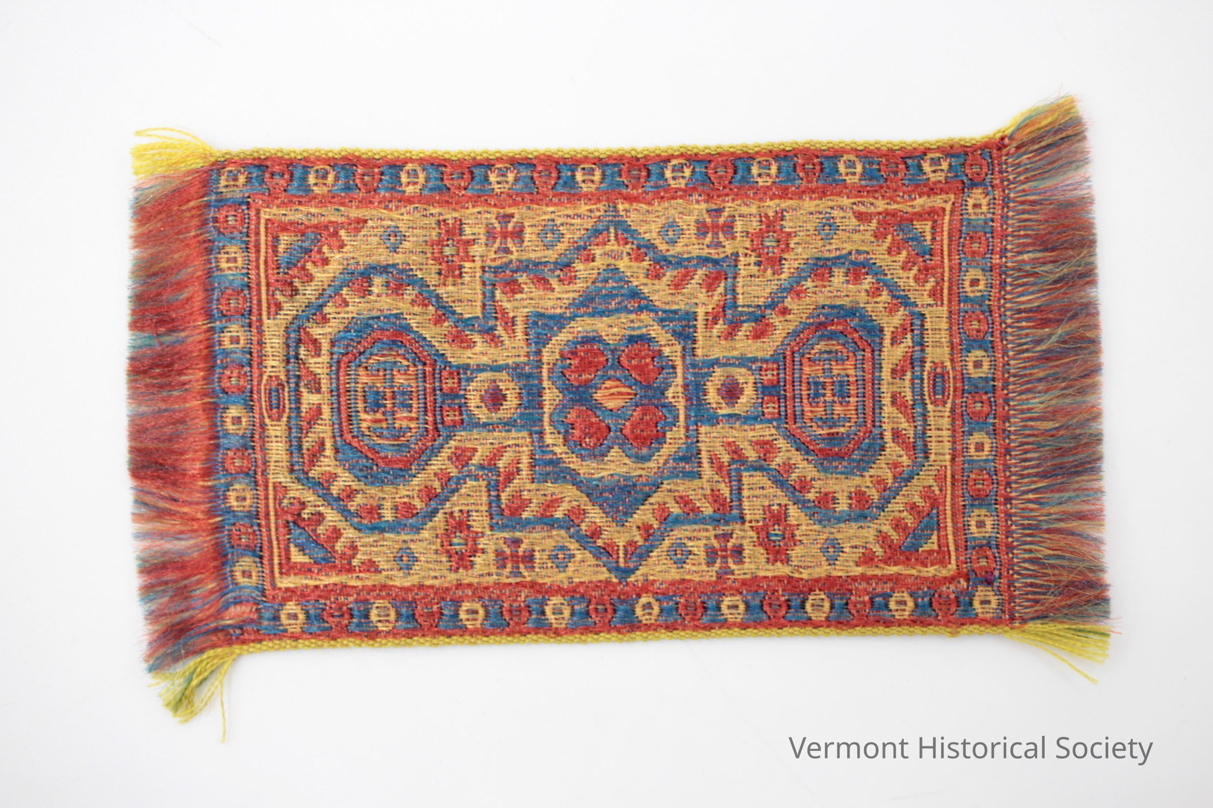 Miniature rug sized for a dollhouse. The rug is woven with an eastern-inspired design in yellow, red, and blue with a large tri-part central medallion. There is red-blue-and-yellow fringe extending from each short edge of the rug.Context