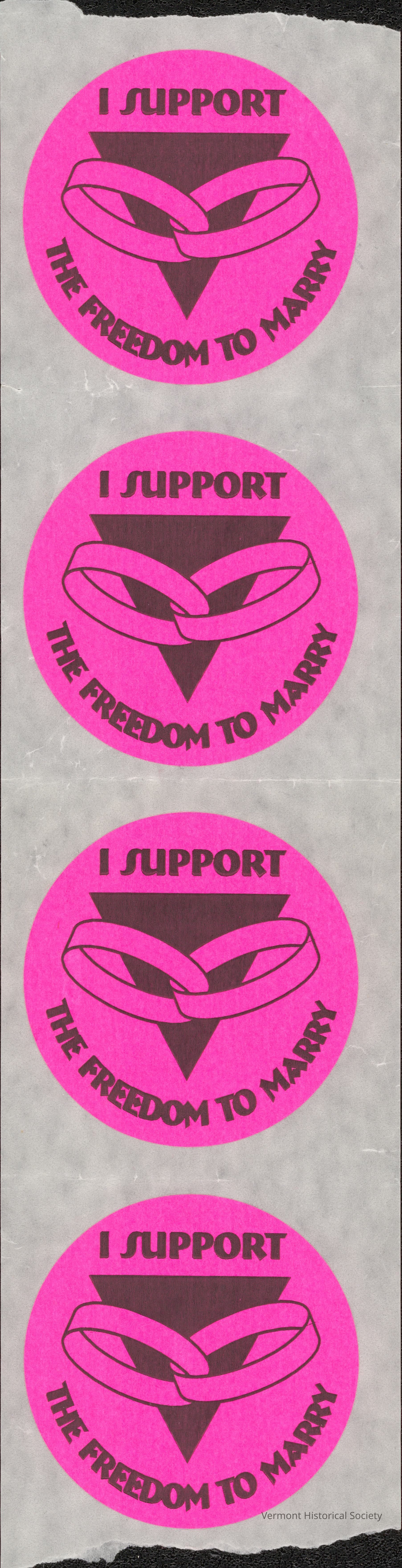 Four circular pink stickers still on backing. Each sticker has the words "I SUPPORT THE FREEDOM TO MARRY" in black text and a design with a black triangle and two interlocking rings.
