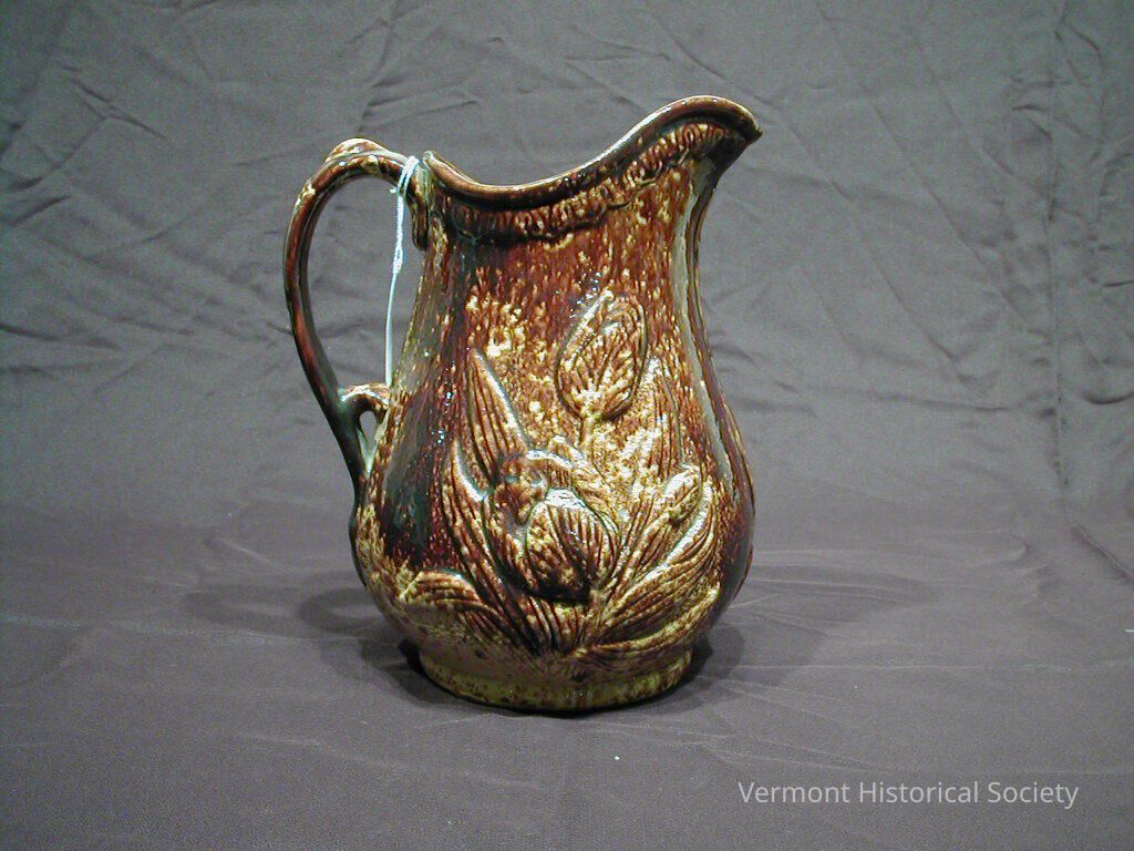 Unmarked ceramic pitch with dark brown mottled glaze. The body of the pitcher is molded with a design of tulips.