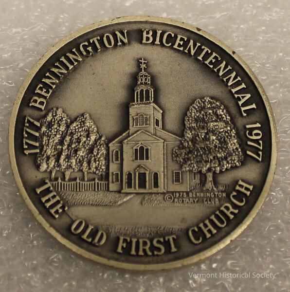 Sterling silver commemorative medal. One side is molded with the inscription, "1777 BENNINGTON BICENTENNIAL 1977 / THE OLD FIRST CURCH" around the edge and an image of a church. The other side is molded with the inscription, "BENNINGTON / VERMONT" around the edge and the image of a setting sun behind the Bennington Monument.