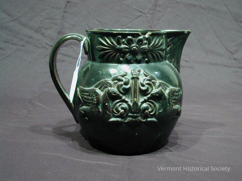 Ceramic pitcher with a lustrous, black glaze. The pitcher is molded in heavy releaf with a classical pattern of scrollwork and griffins.
