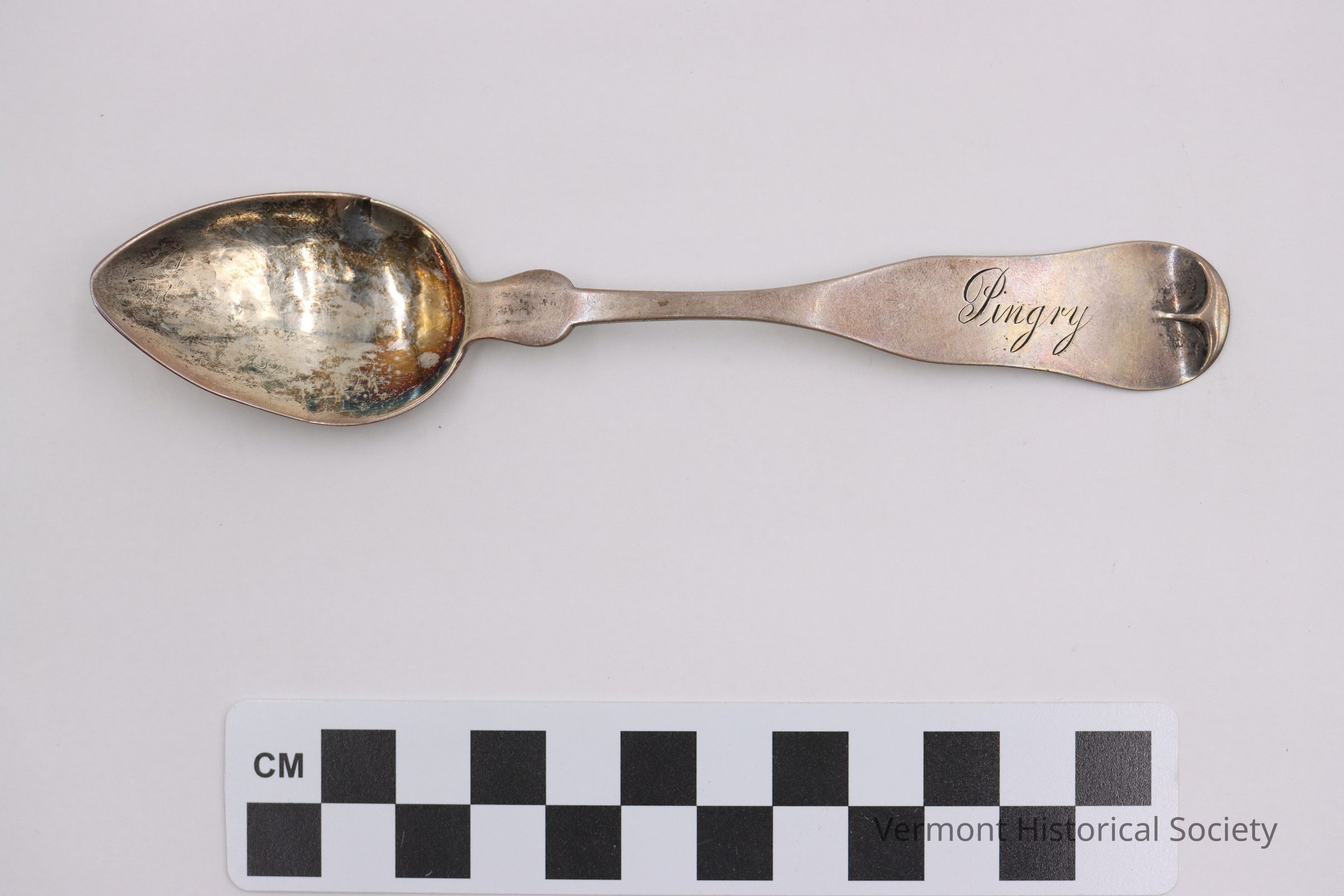 Coin silver teaspoon with a pointed bowl and rounded shoulder. The handle is engraved with the name "Pingry". The back of the handle is marked "R.O. FORBUSH" and "PURE COIN."