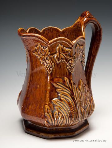 Brown glazed molded ceramic pitcher. The pitcher is molded into 8 facets, each scalloping upward at the rim. The exterior is molded with a vine of grapes at the top and tall leaves on the bottom.