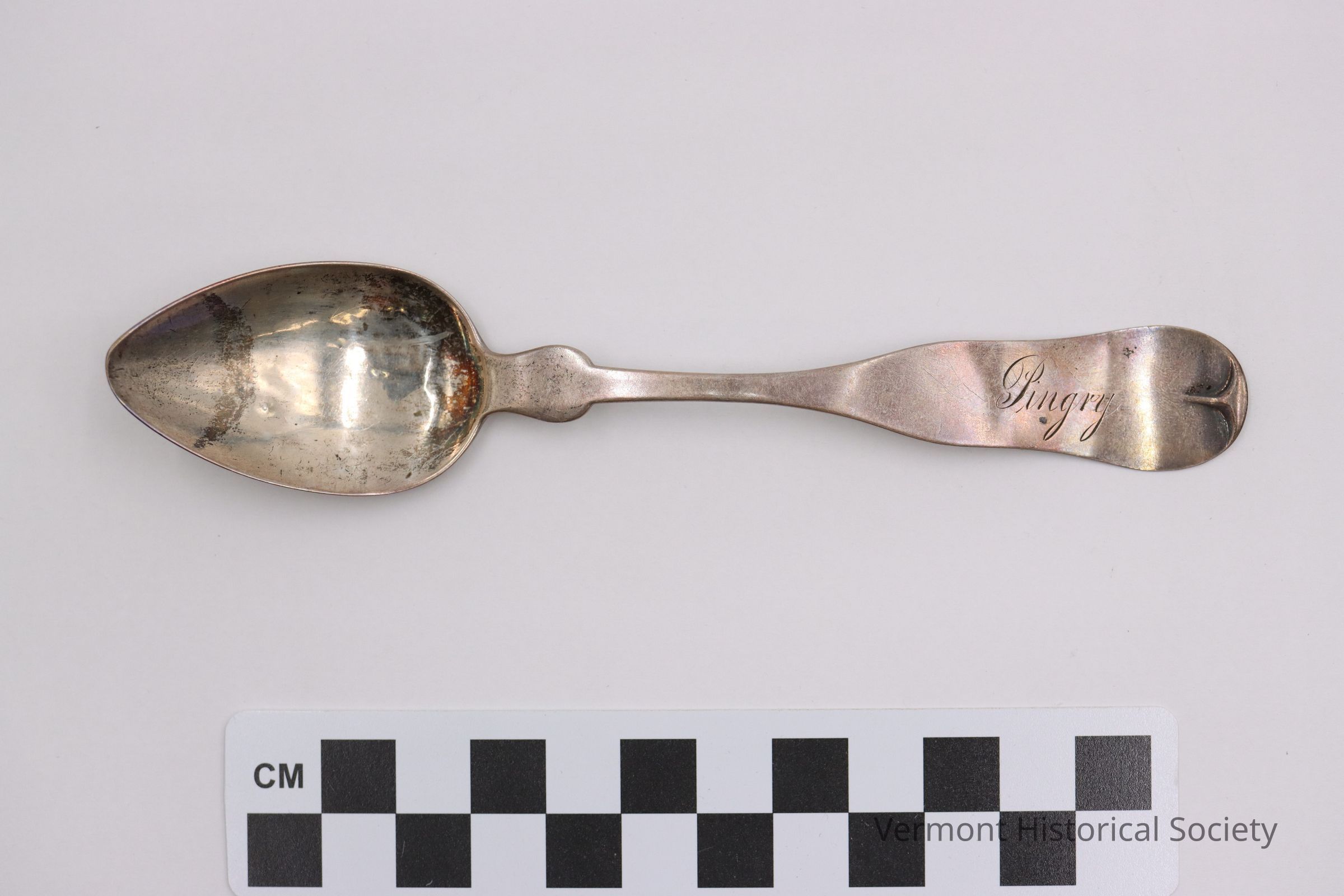 Coin silver teaspoon with a pointed bowl and rounded shoulder. The handle is engraved with the name "Pingry". The back of the handle is marked "R.O. FORBUSH" and "PURE COIN."