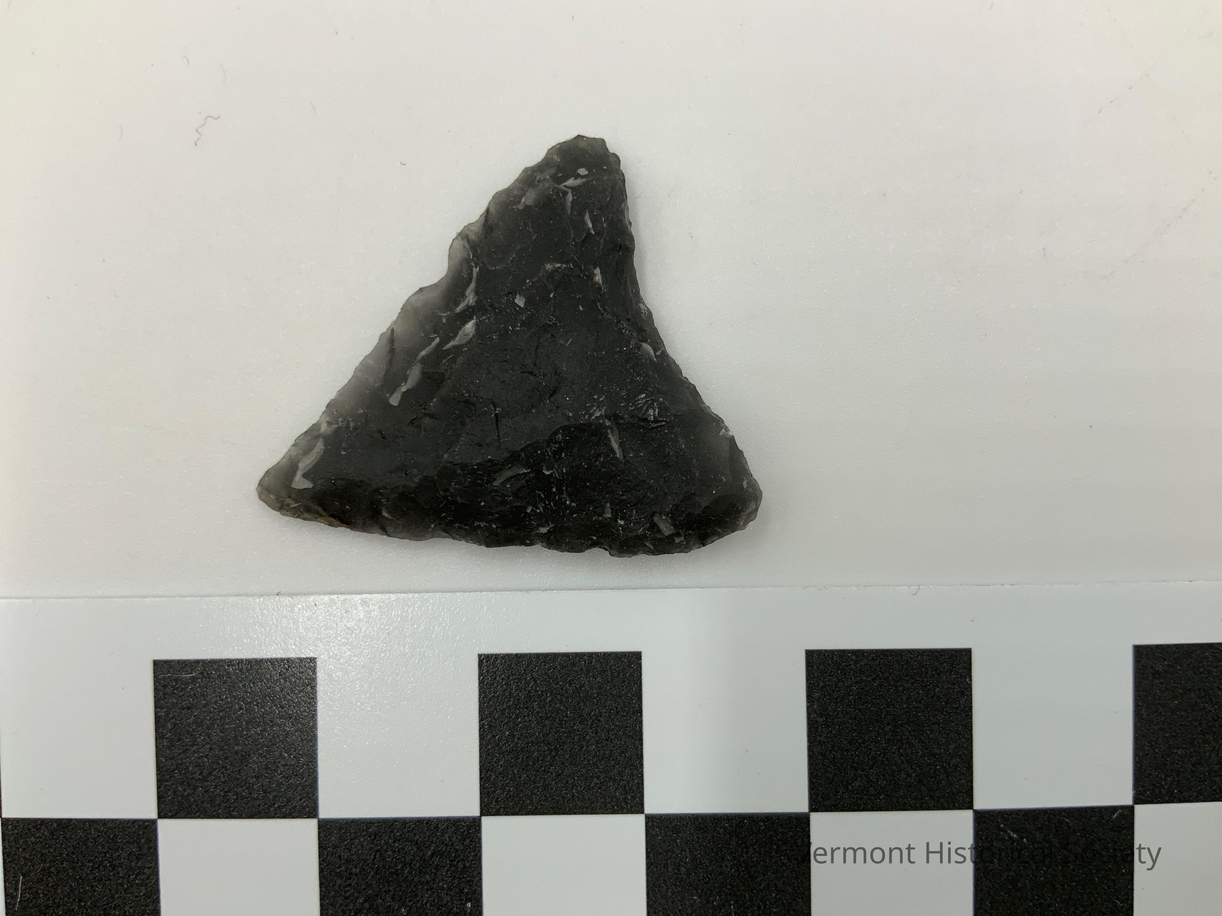 Triangular gray chipped stone projectile point. One edge is straight, one edge curved slightly outward, and the other edge curves inward.Context