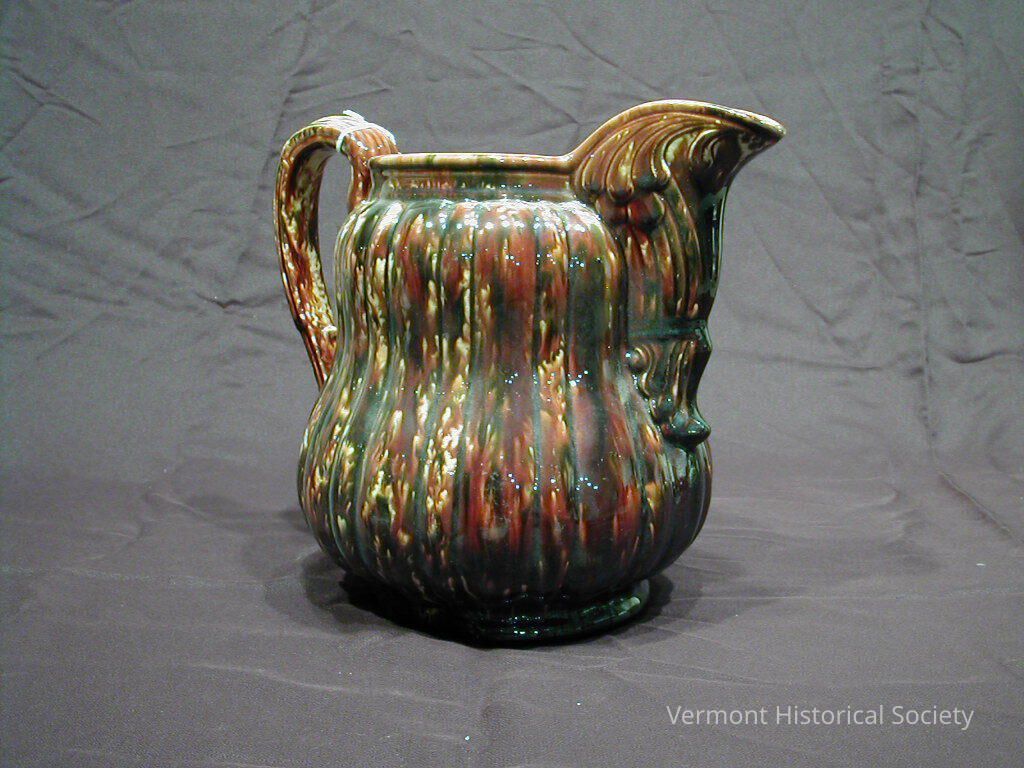 Ceramic pitcher with a mottled brown and dark green glaze. The body of the pitcher is fluted and flares outward near the bottom. It has a large, foliated spout that begins about halfway down the pitcher's body. It is marked on the base, but the mark is illegible.