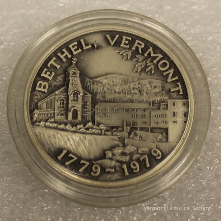 Commemorative medal molded with pictorial scenes on both sides. One side shows a church and a factory in front of mountains with the inscription, "BETHEL, VERMONT 1779-1979", around the edge. The other side shows a stag in a field with a jumping trout in the foreground and the inscription, "EAST BETHEL . CHRISTIAN HILL . LUMPUS . LILLIESVILLE . CAMP BROOK . GILEAD".Context