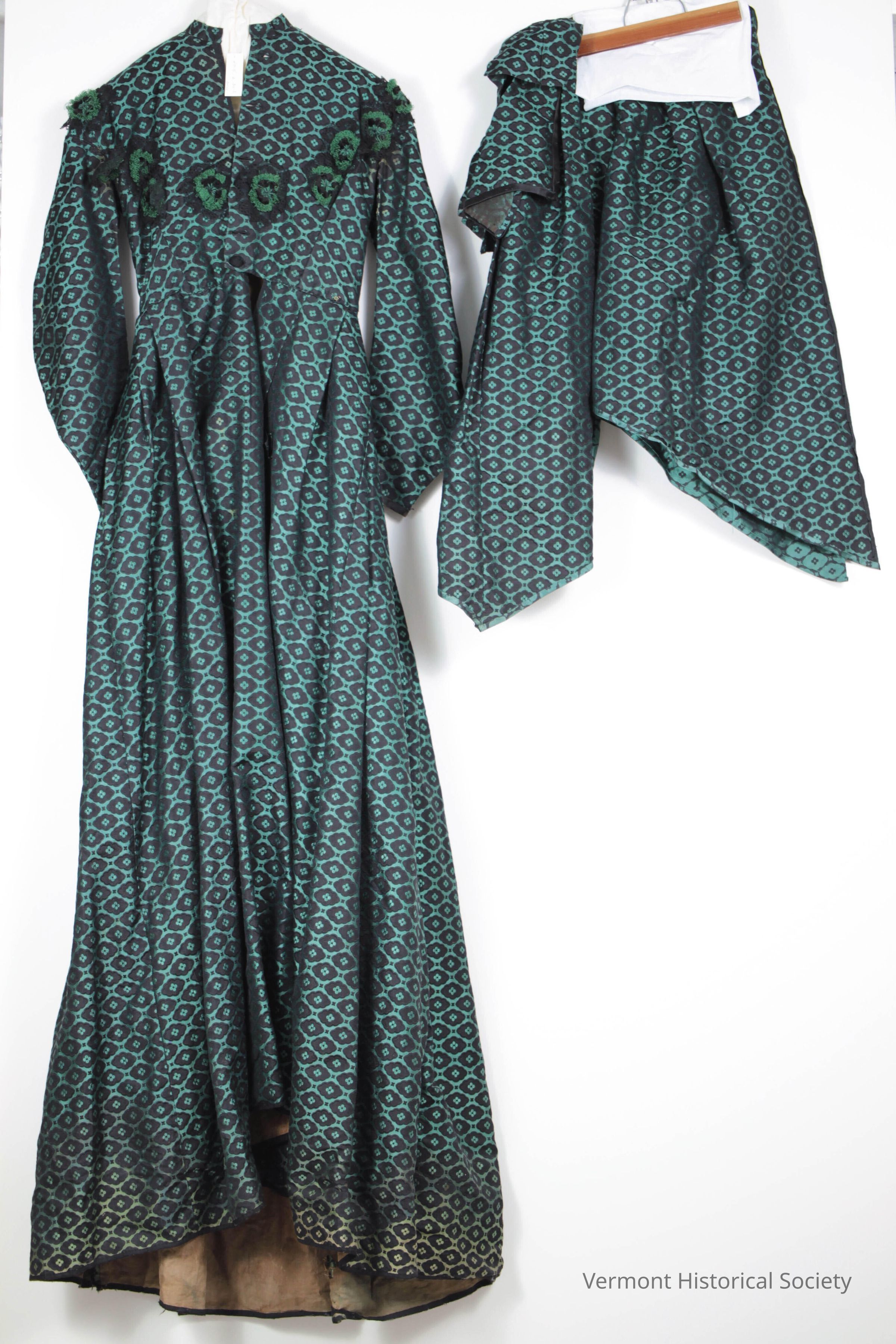 Teal and black brocade dress and separate overskirt. The fabric is woven in a closely repeated pattern of black medallions with a teal quatrefoil in the center on teal ground. The dress has long, curved sleeves with no cuffs. The bodice secures up the center front. The waistline sits either at the wearer's natural waist or just above. The bodice is decorated with several green and black rosettes placed in a U-shape from the shoulders across the bust. There is a very slight train at the hem of the skirt, and the hem is faced with glazed cotton. The handwritten tag "Mrs. Eben Sutton" is stitched into the back of the bodice lining. The overskirt is made from the same fabric of the dress and is gathered at the back and held with a large bow lined in black netting.Context