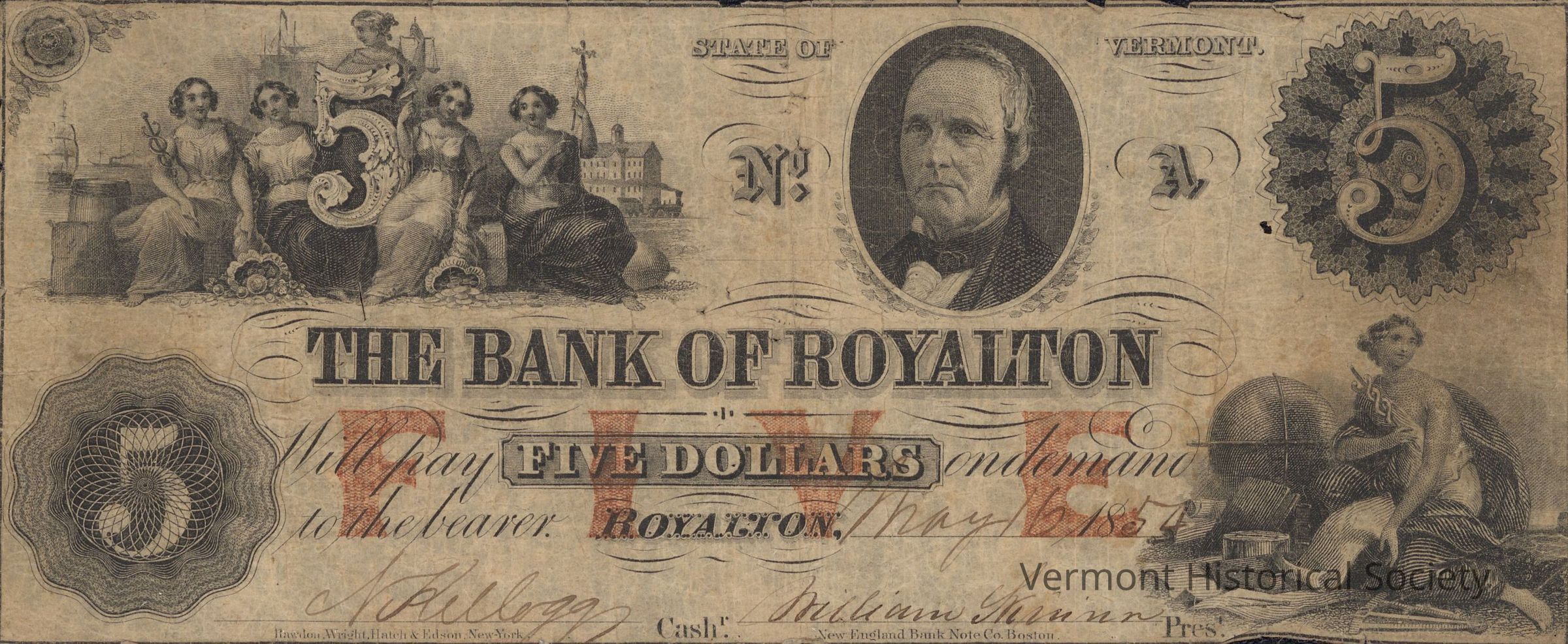 Private bank note for 5 dollars from The Bank of Royalton. The serial number is not filled out. It is dated May 16, 1854, and signed by N. Kellogg and William Kinnn.